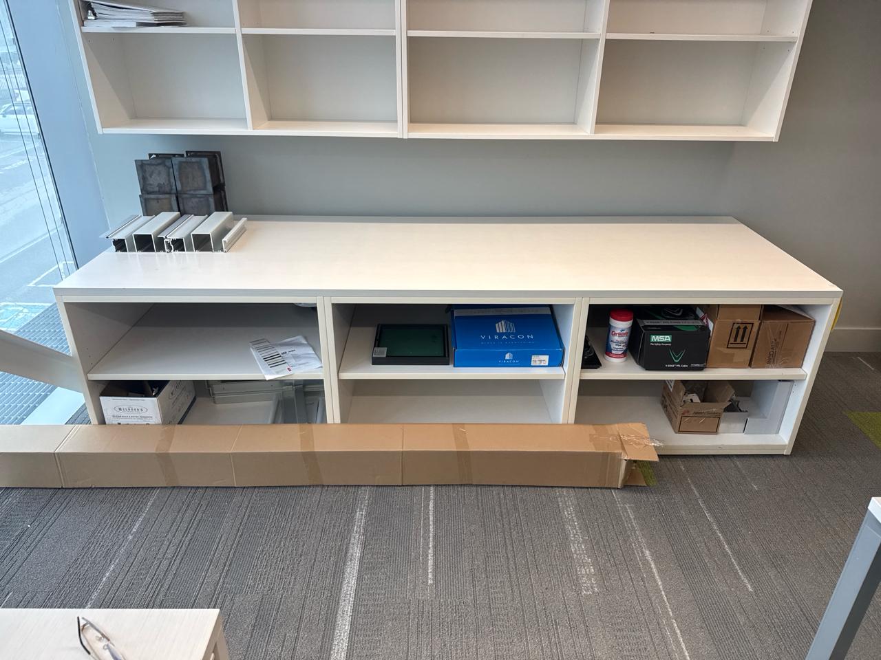 Office furniture, shelving desk unit 9ft length 3ft width x 29 inch height. Contents excluded. [2nd floor Office]