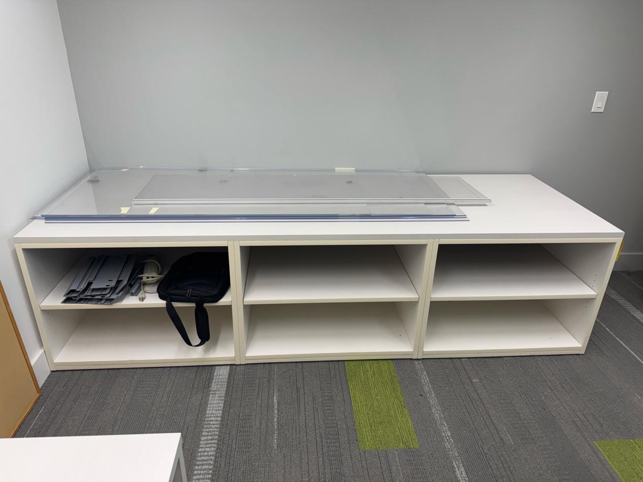 Office furniture, shelving desk unit 9ft length 3ft width x 29 inch height. Contents excluded. [2nd floor Office]