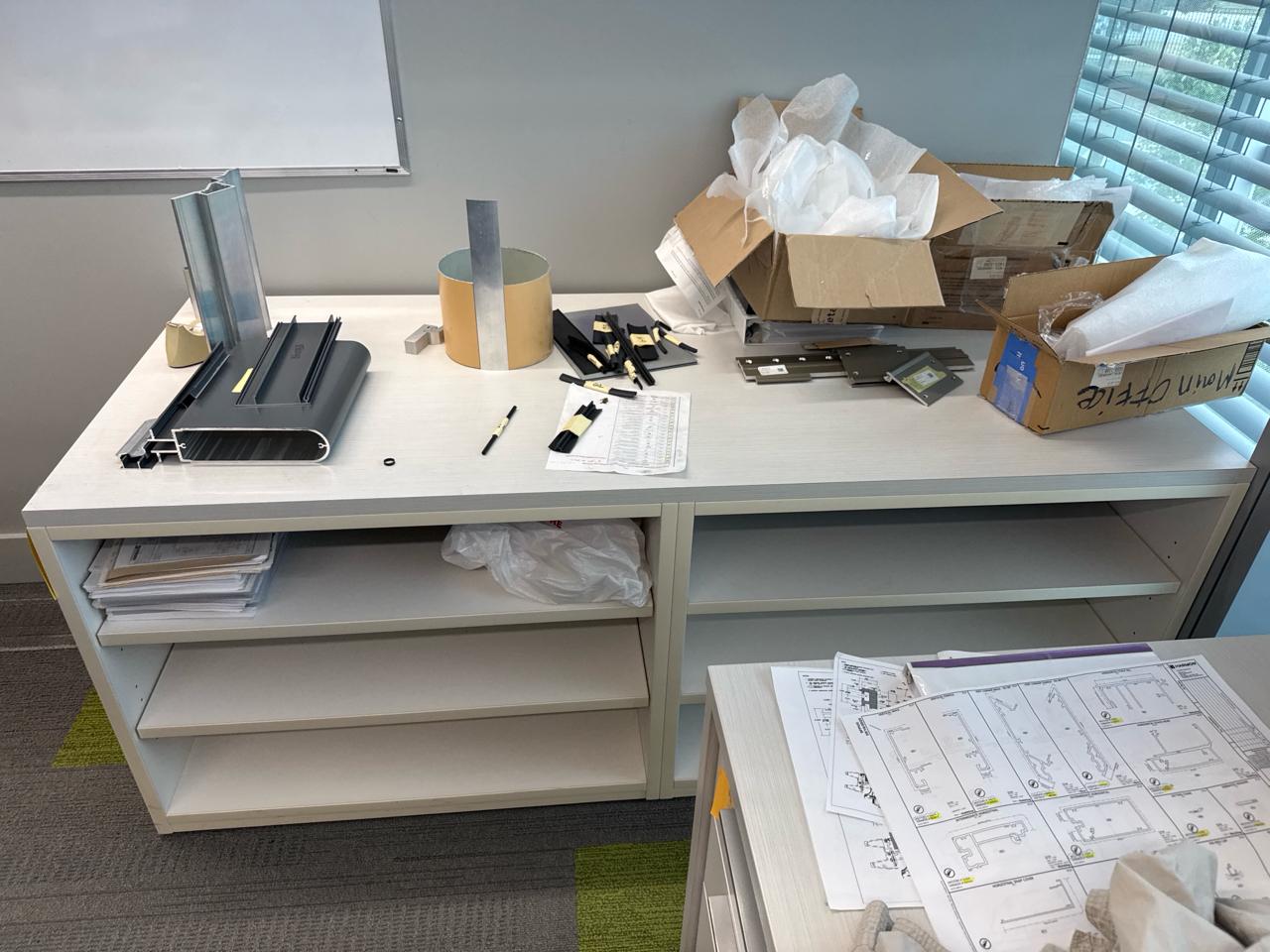 Office furniture, shelving desk unit 6ft length 30 inch width x 29inch height. Contents excluded. [2nd floor Office]