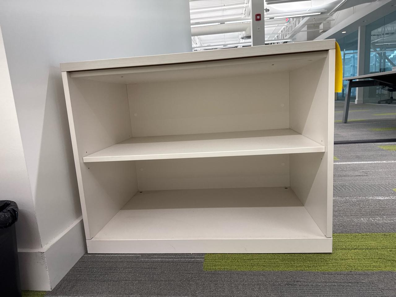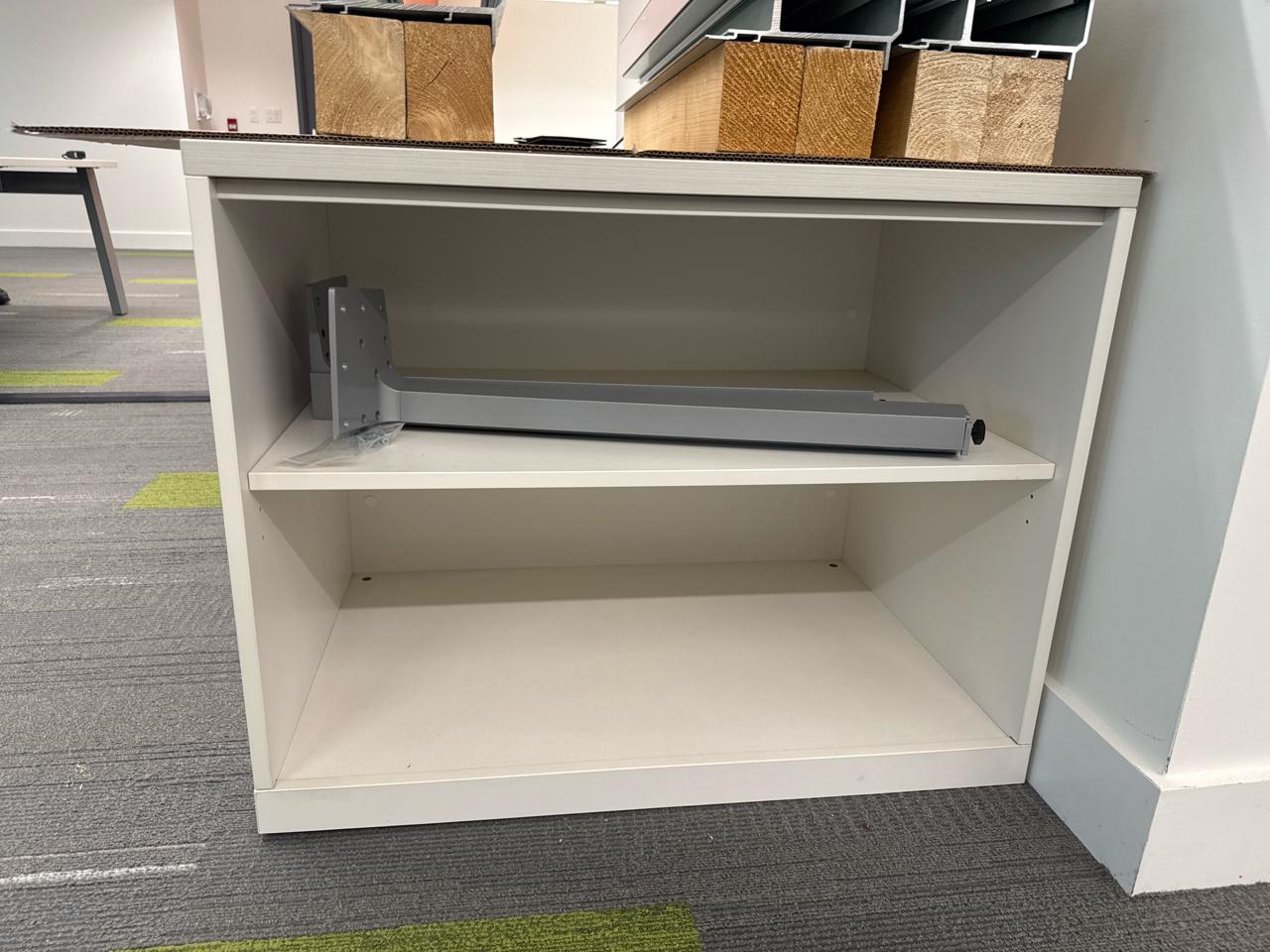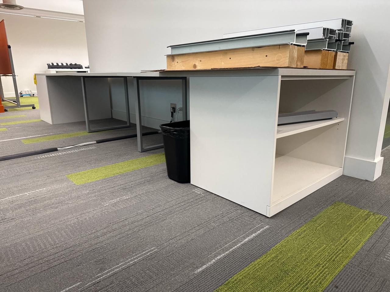 Office furniture, extended table with shelving, 14 ft length x 3 ft width x 28.5 inch height, contents not included, [2nd floor Office]
