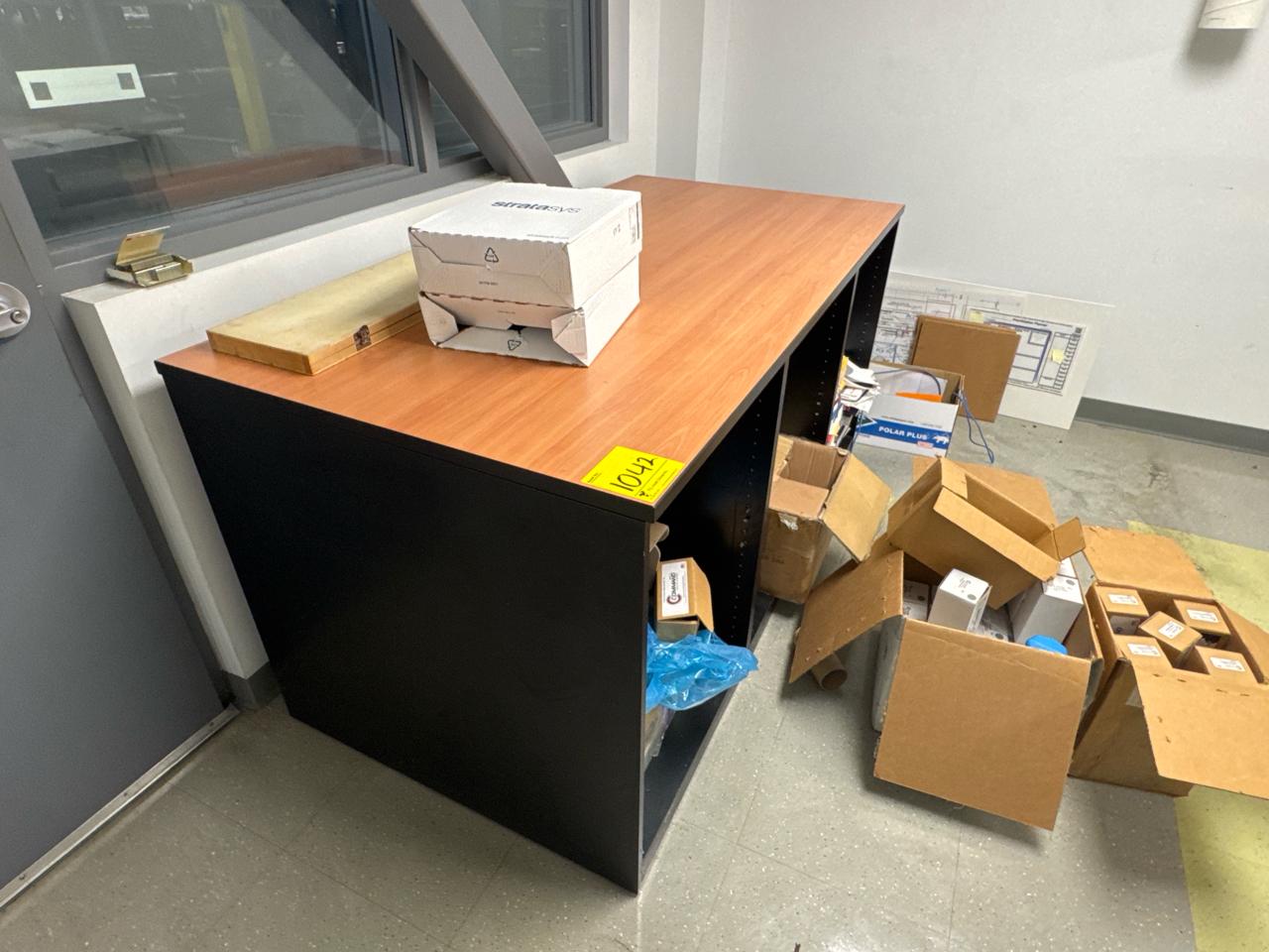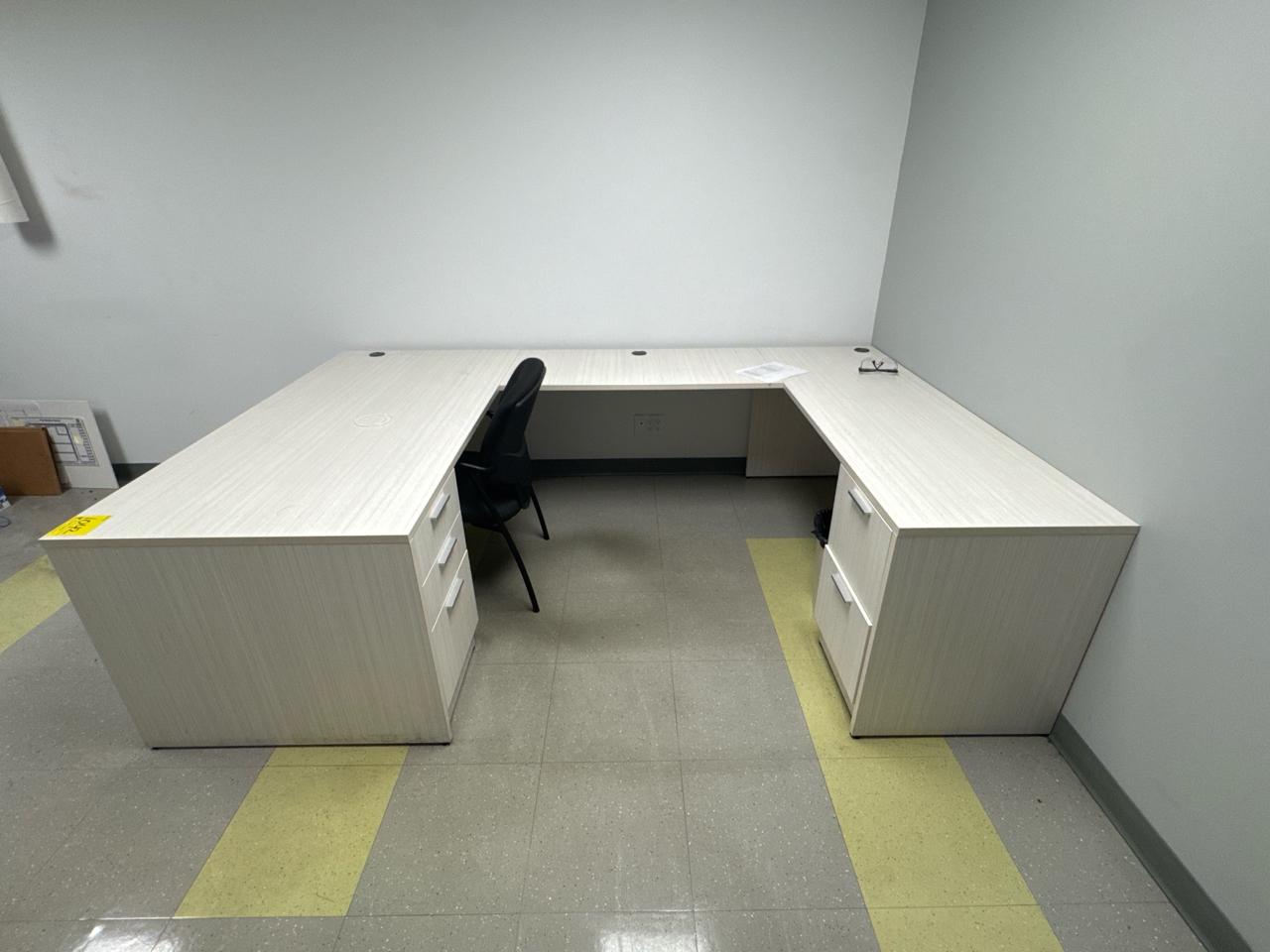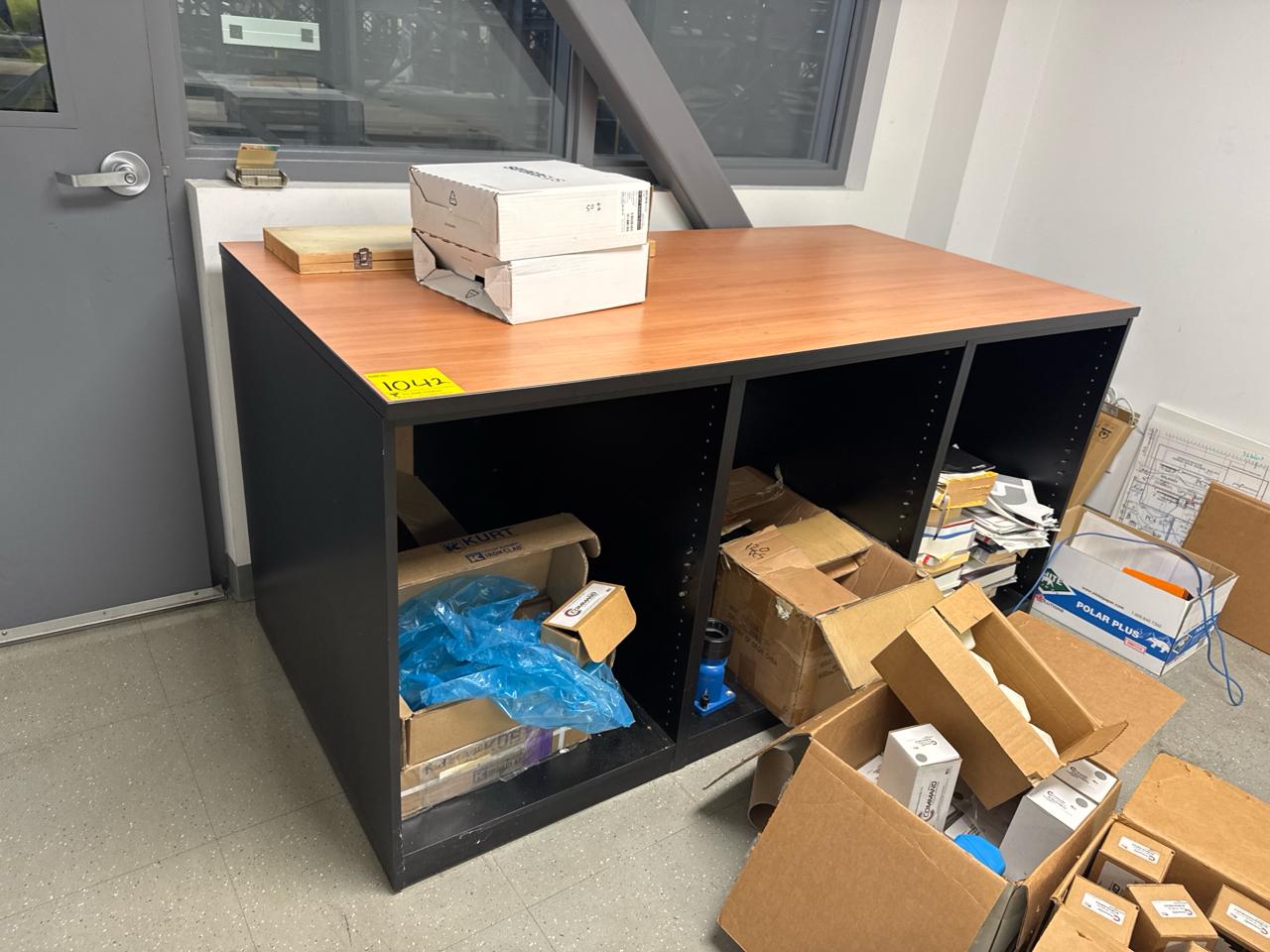 Office furniture, U-shaped table 9 ft length x 6 ft width 29.5 height, brown desk storage 6 ft length x 36.5 inch width x 3 ft height, table 80 inch length x 17.5 width x 32 inch height, contents not included. [Fabrication]