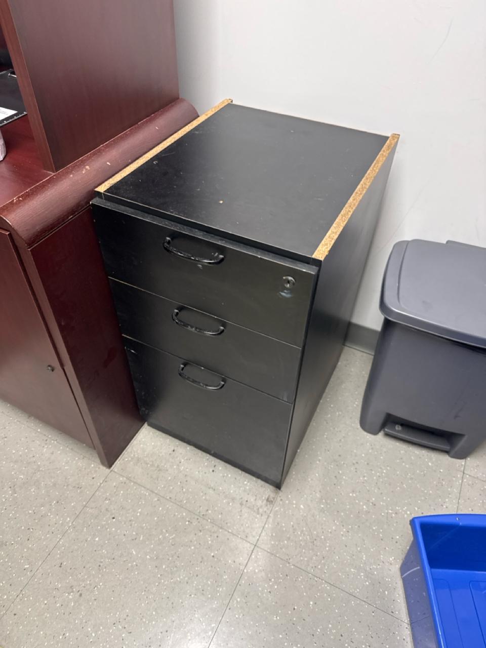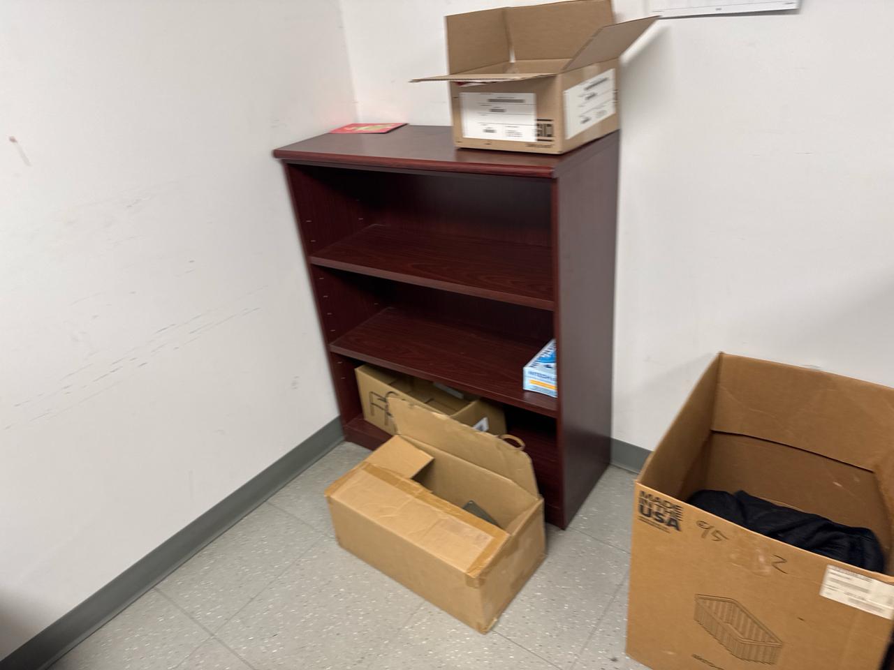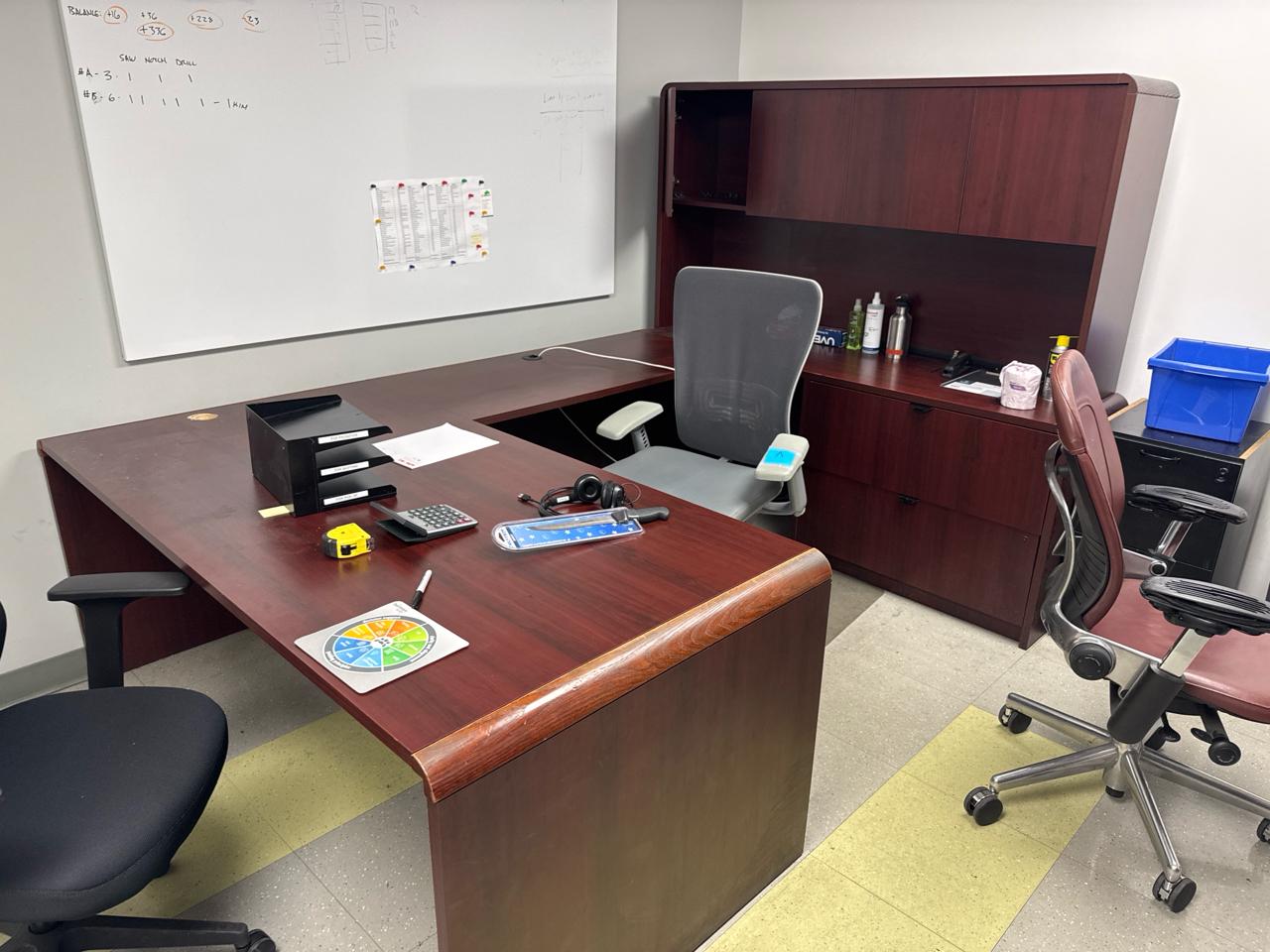 Office furniture, U-shaped desk, cabinet, (1) office chair, (2) shelving units. 3 door filing cabinet. Contents not included. [Fabrication]