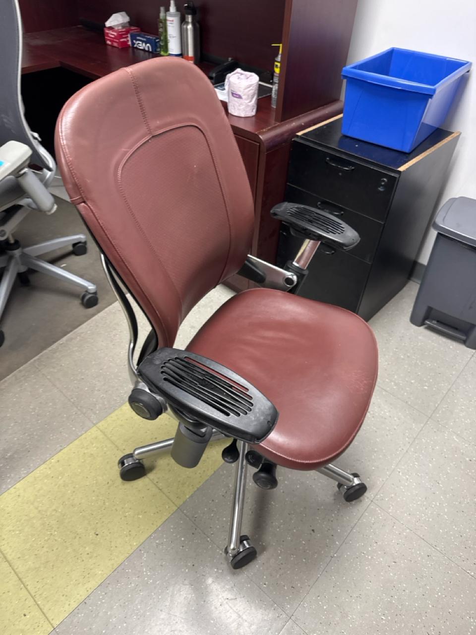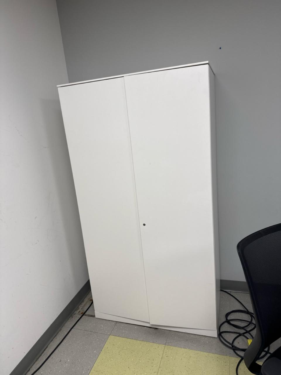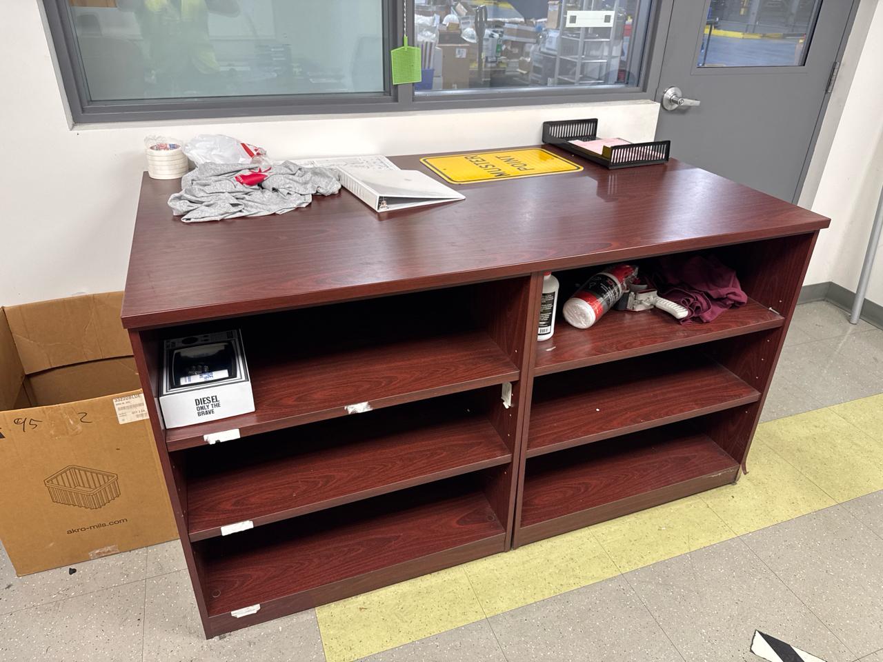Office furniture, U-shaped desk, cabinet, (1) office chair, (2) shelving units. 3 door filing cabinet. Contents not included. [Fabrication]