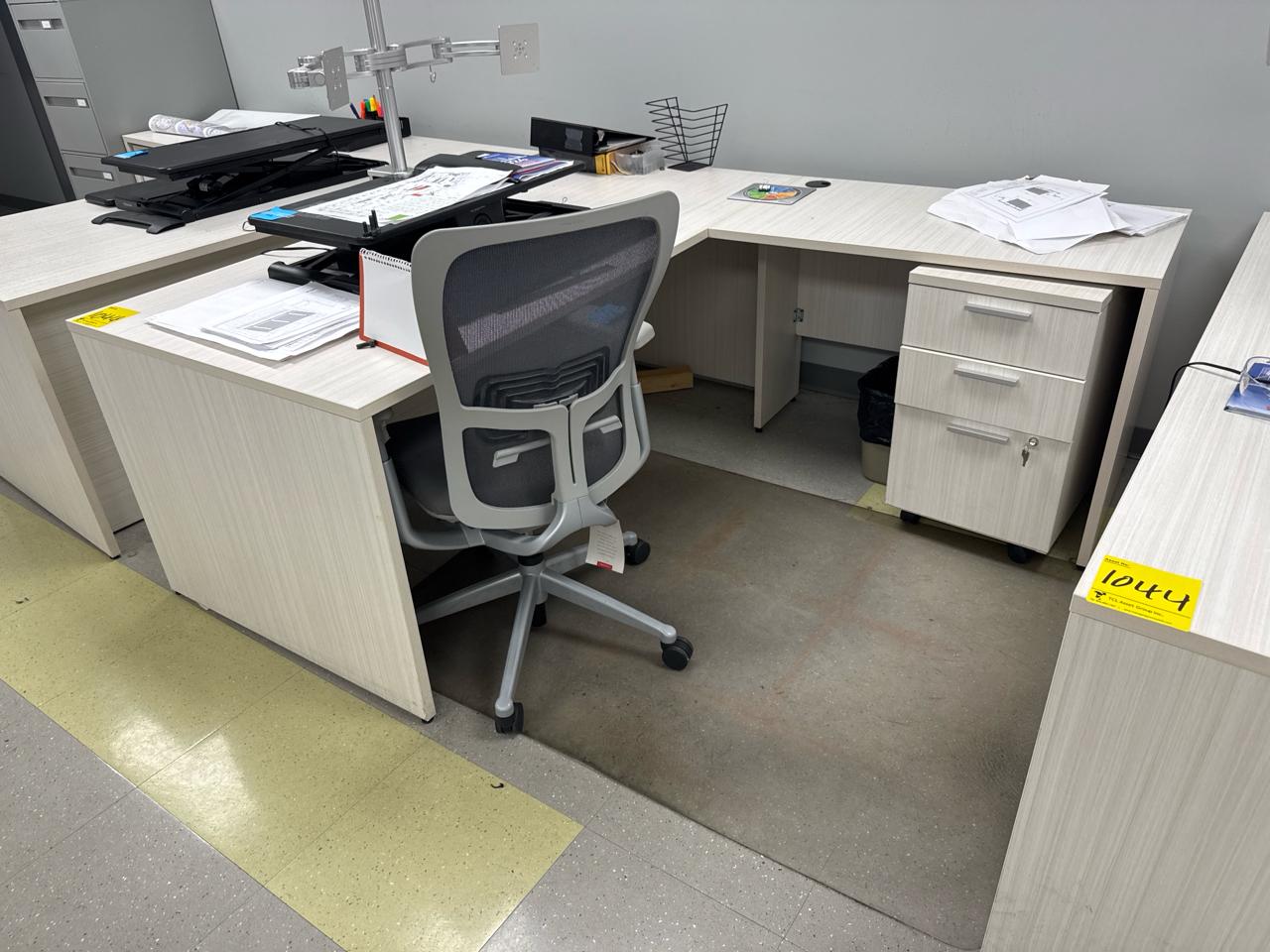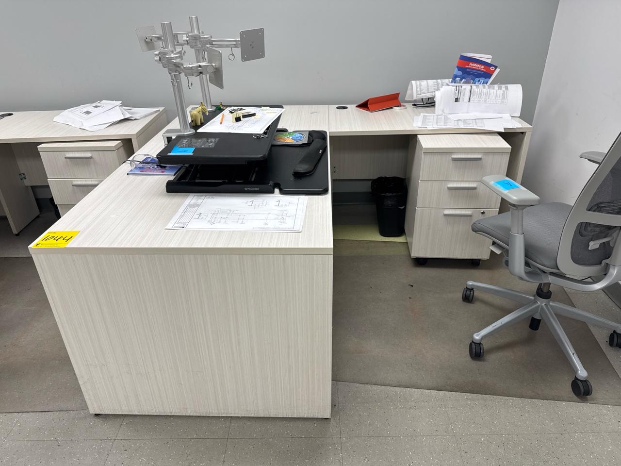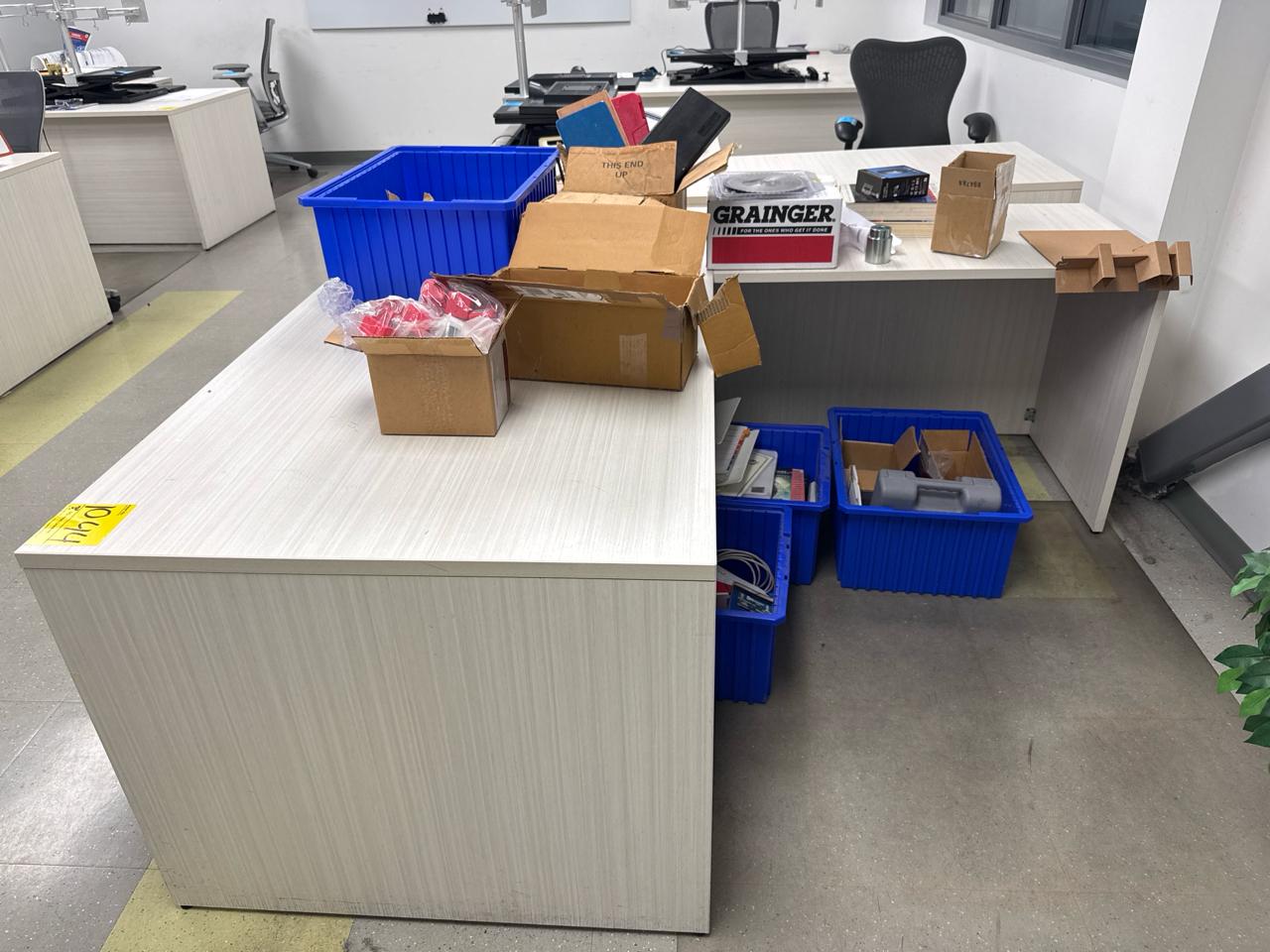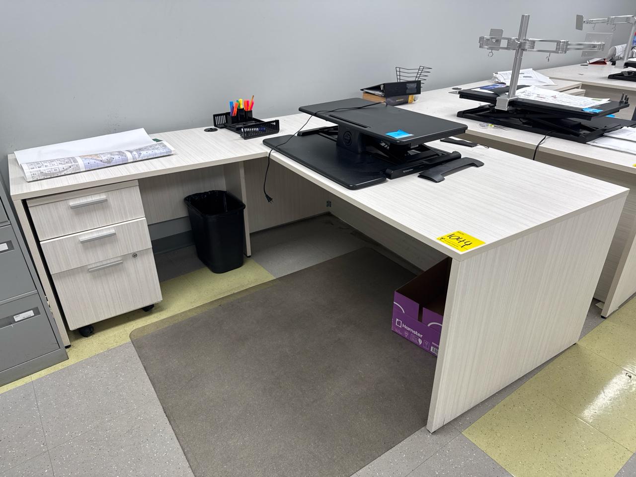 Office furniture, (6) L-shaped desks, (1) desk, (7) rolling filing cabinets, (1) 4-door filing cabinet. Contents not included [Fabrication]