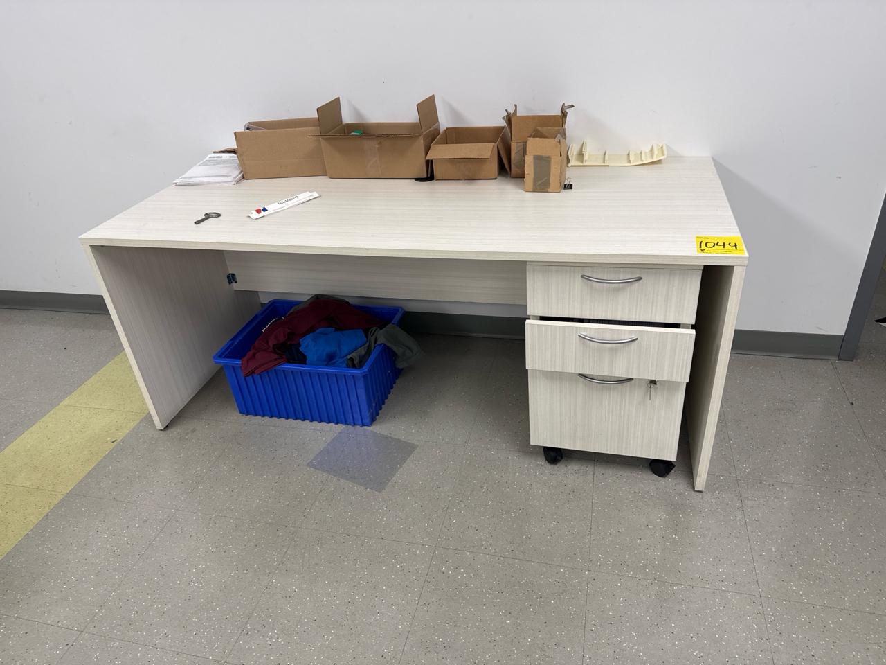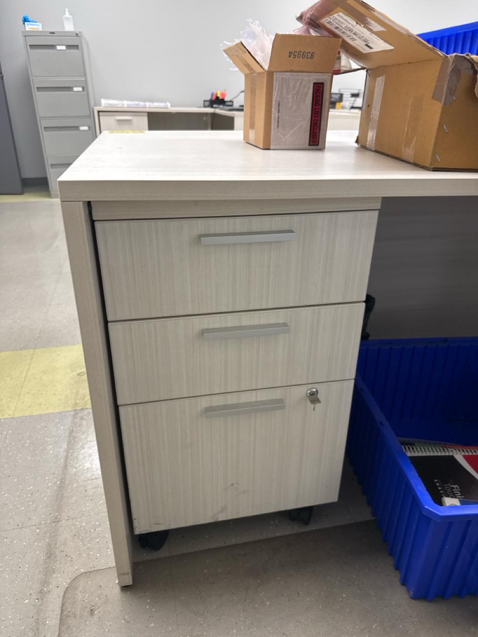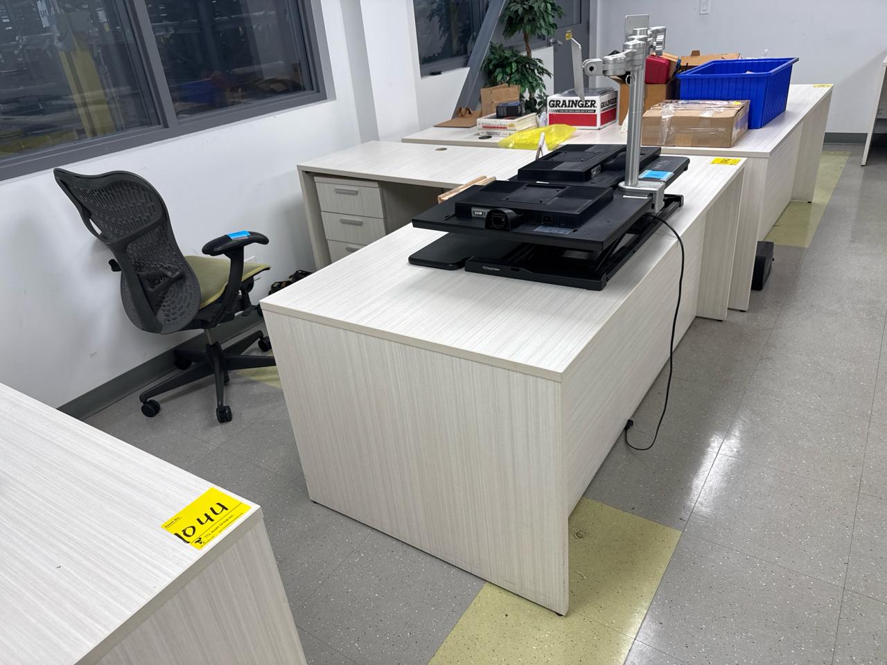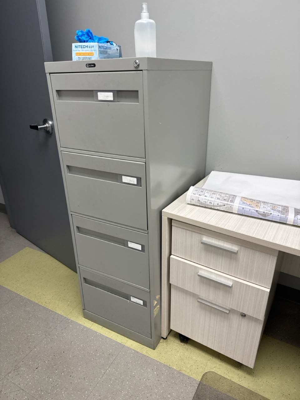 Office furniture, (6) L-shaped desks, (1) desk, (7) rolling filing cabinets, (1) 4-door filing cabinet. Contents not included [Fabrication]