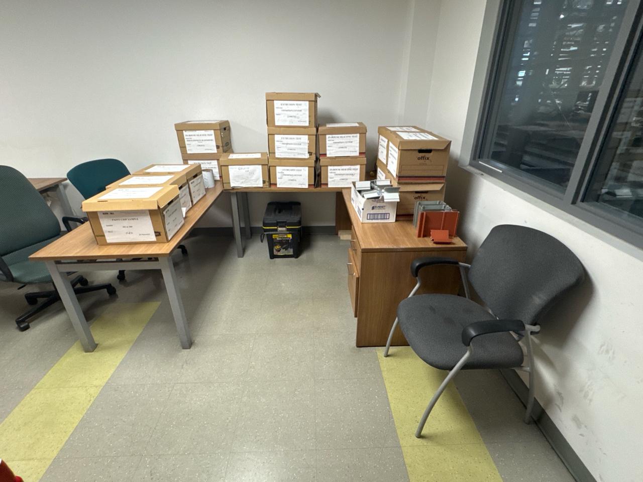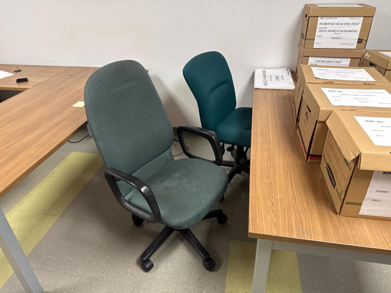 Office furniture, (2) U-shaped desks, (4) office chairs, Contents not included [Fabrication]