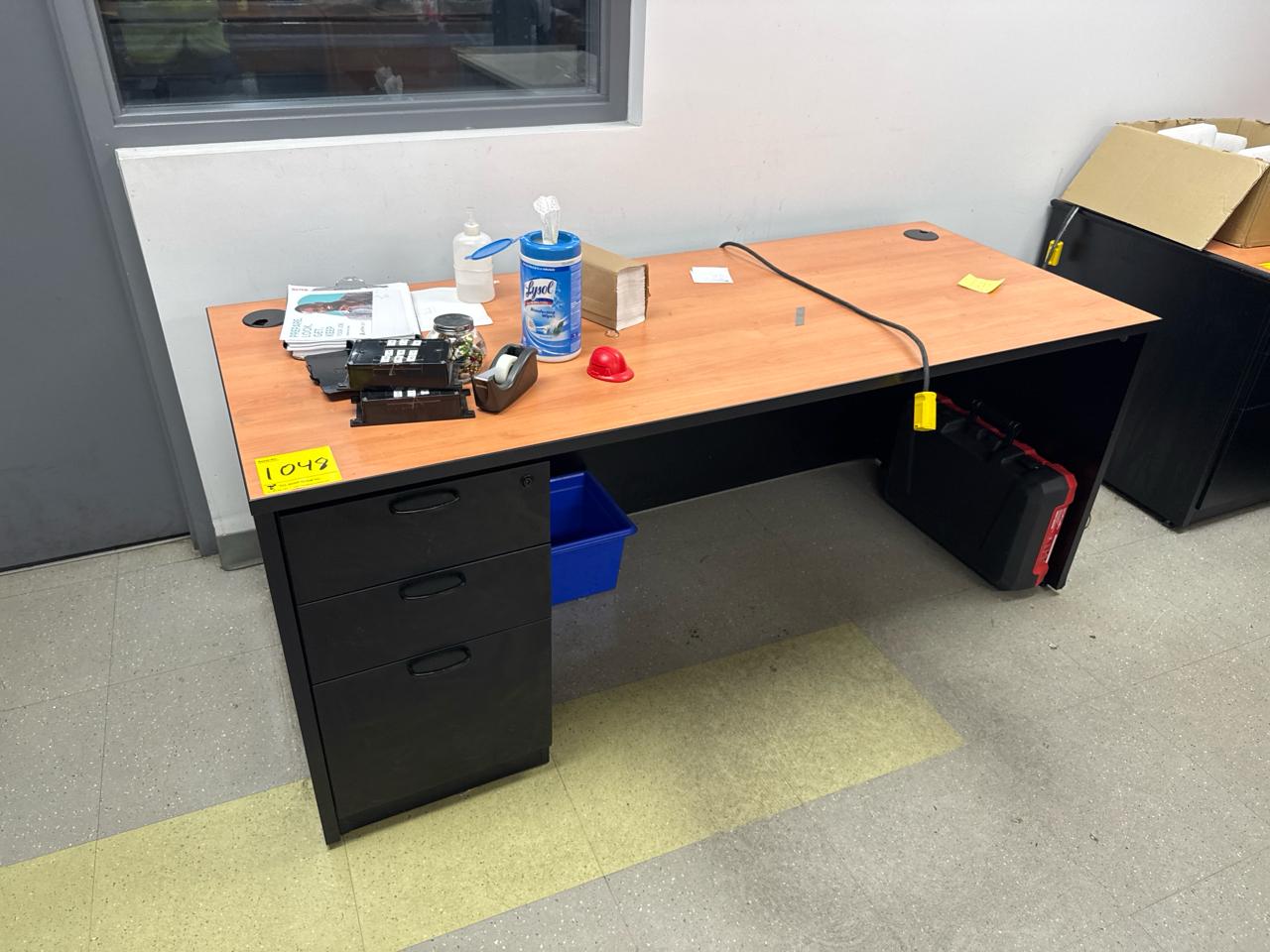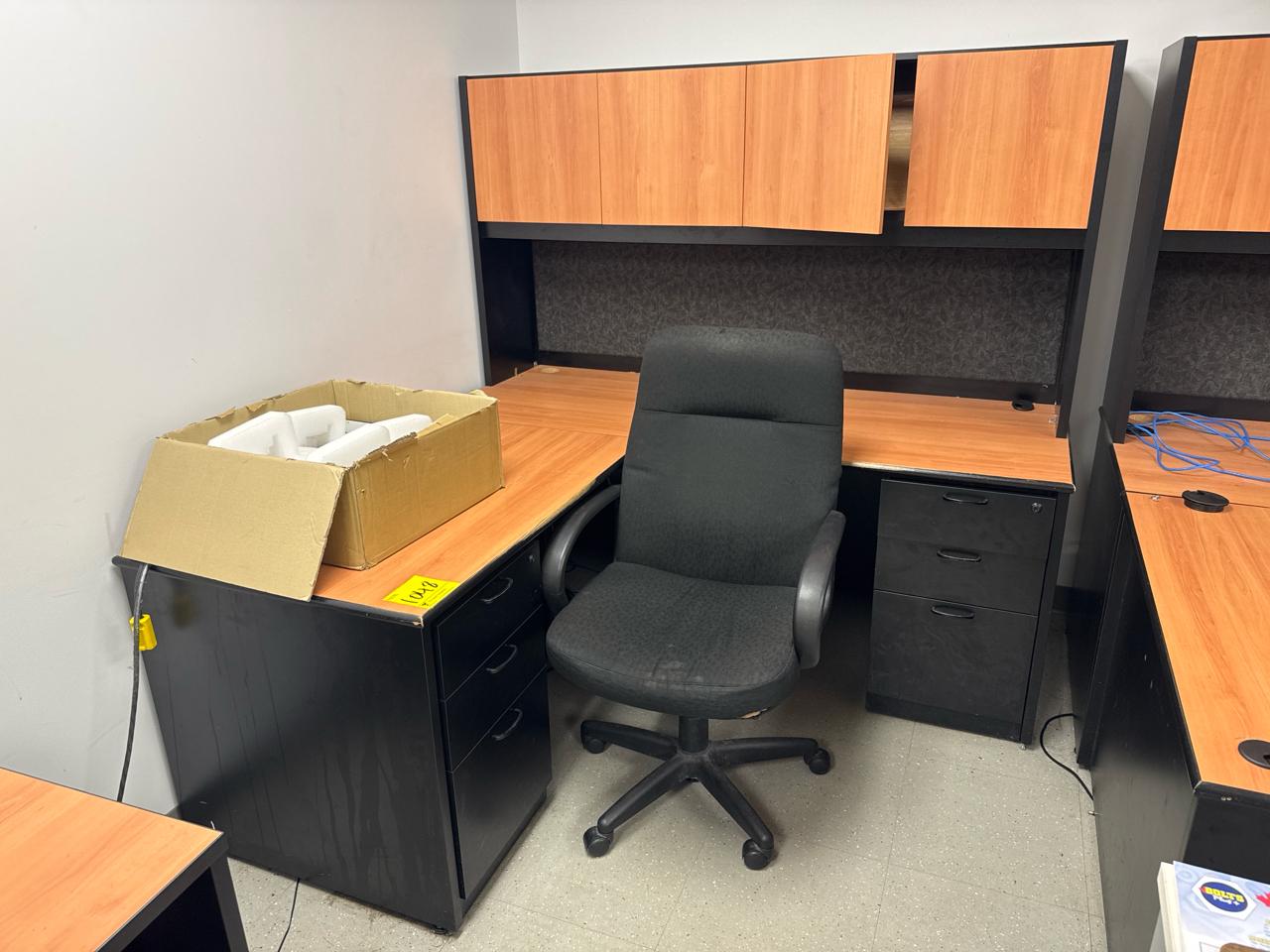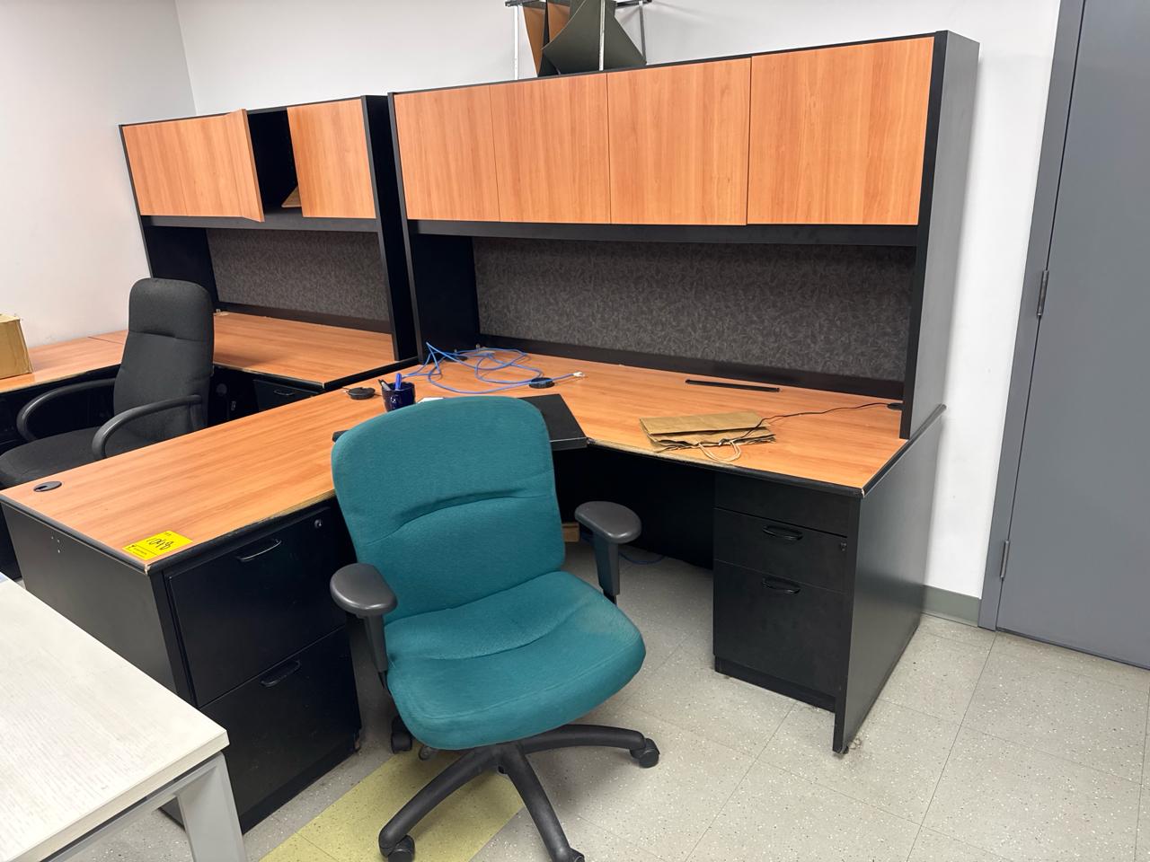 Office furniture, (2) L-shaped desks, (1) desk, (2) office chairs. Contents not included [Fabrication]