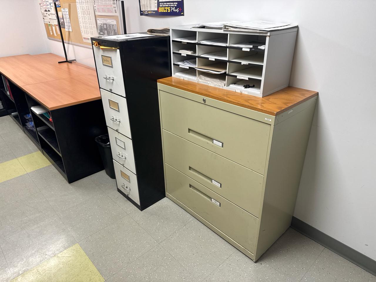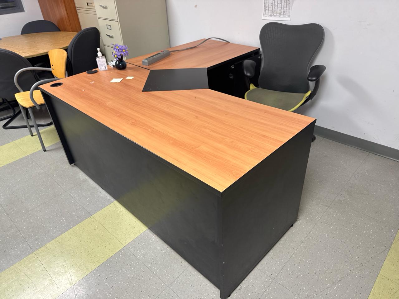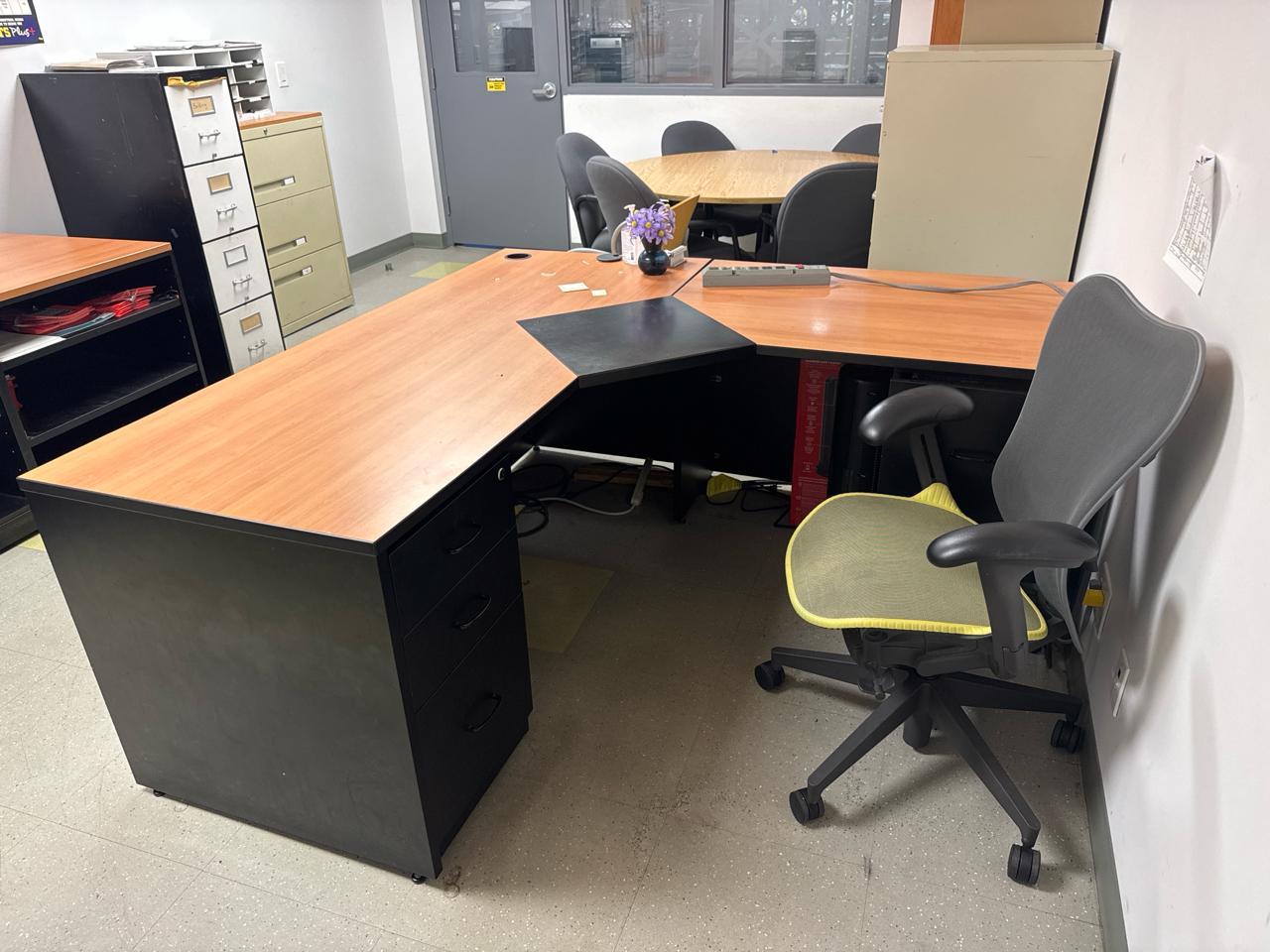 Office furniture, (1) L-shaped desks, (2) desks, (8) chairs. (1) cabinet, (4) filing cabinets Contents not included [Fabrication]