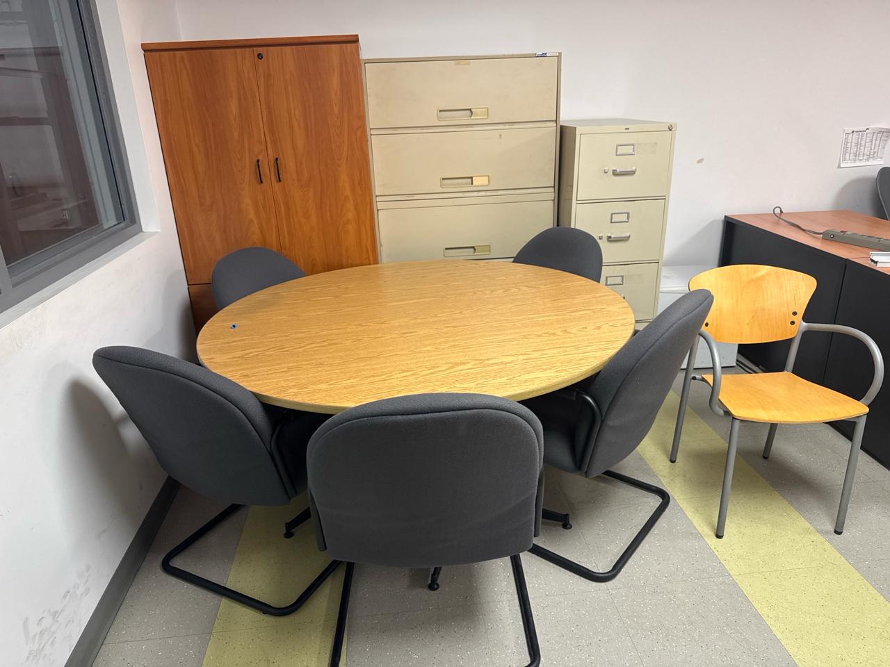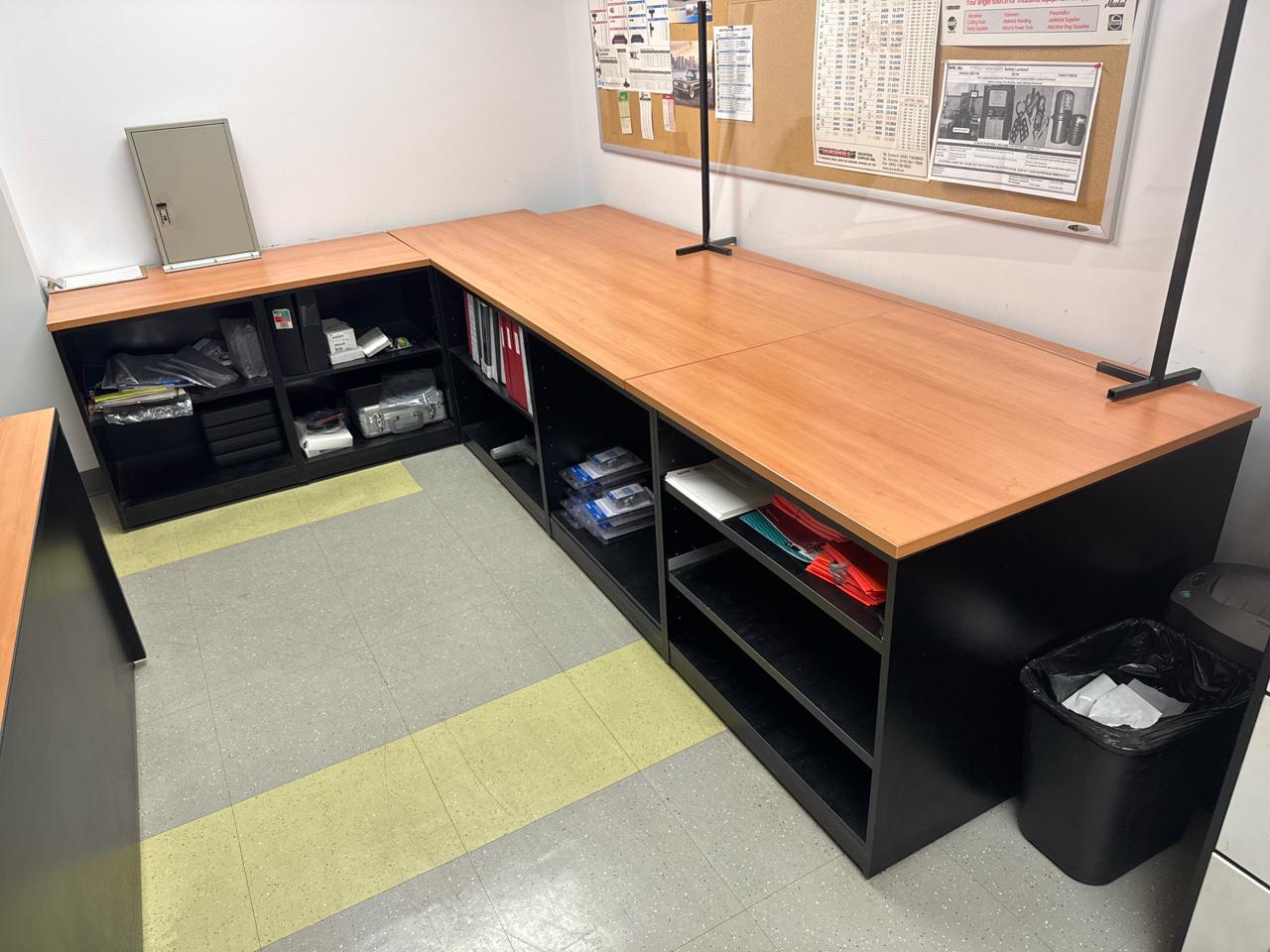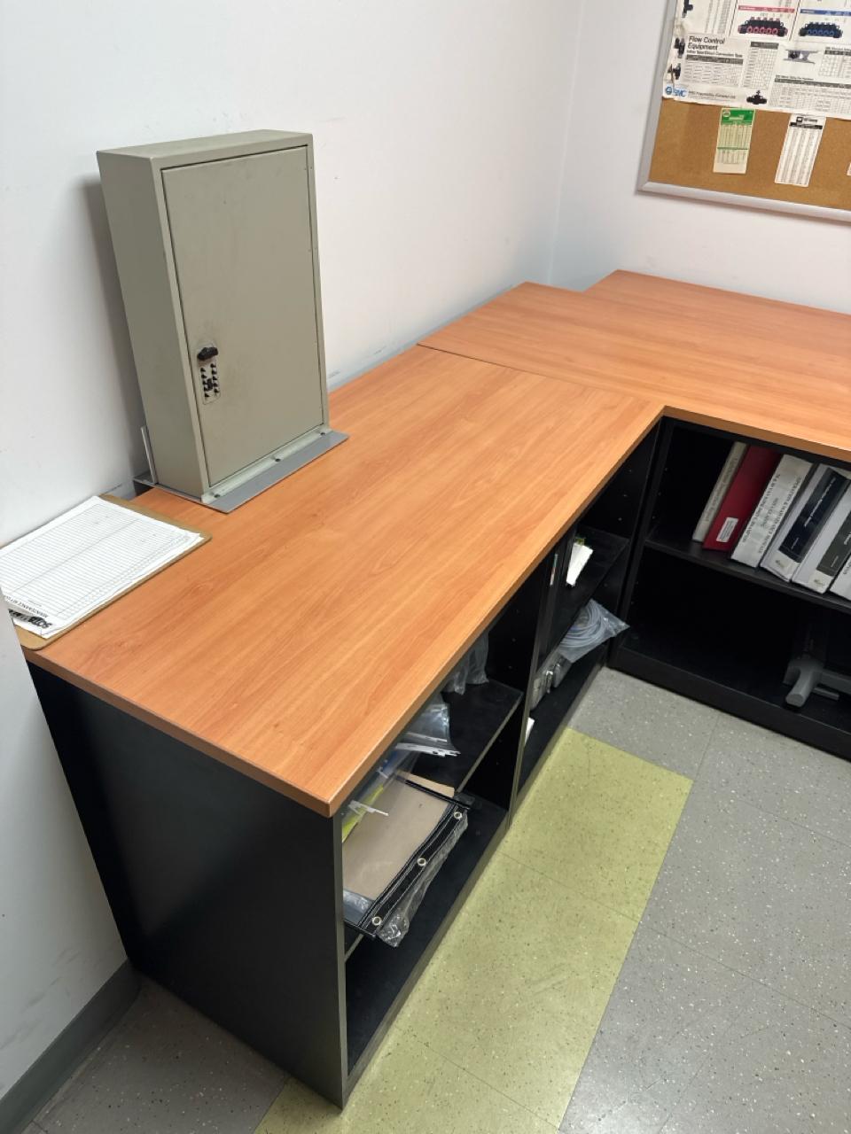 Office furniture, (1) L-shaped desks, (2) desks, (8) chairs. (1) cabinet, (4) filing cabinets Contents not included [Fabrication]