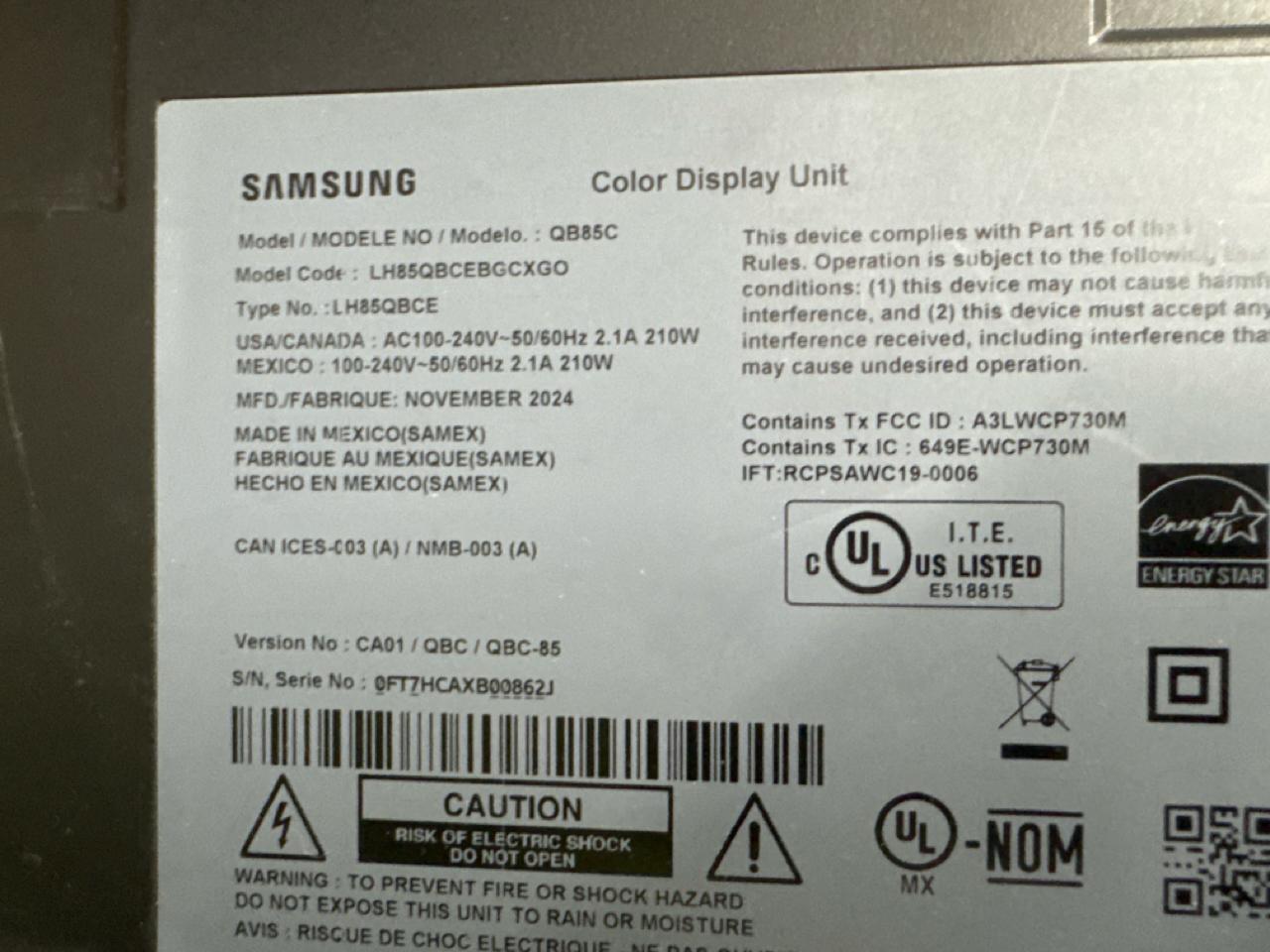 Samsung 85 inch Television, [Loc. Assembly Area]