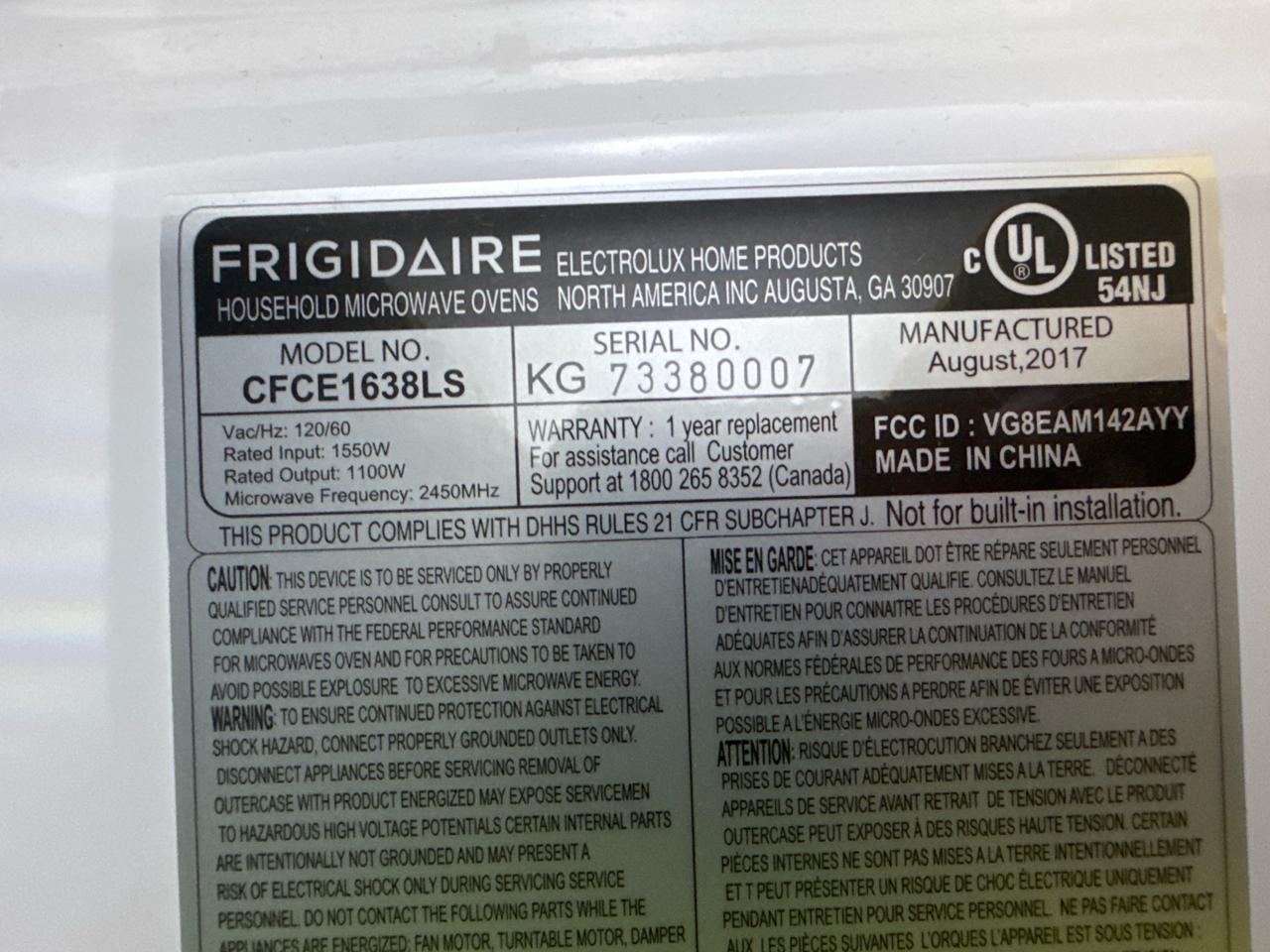 Frigidaire microwave, Model CFCE1638LS, [Loc. Fabrication]