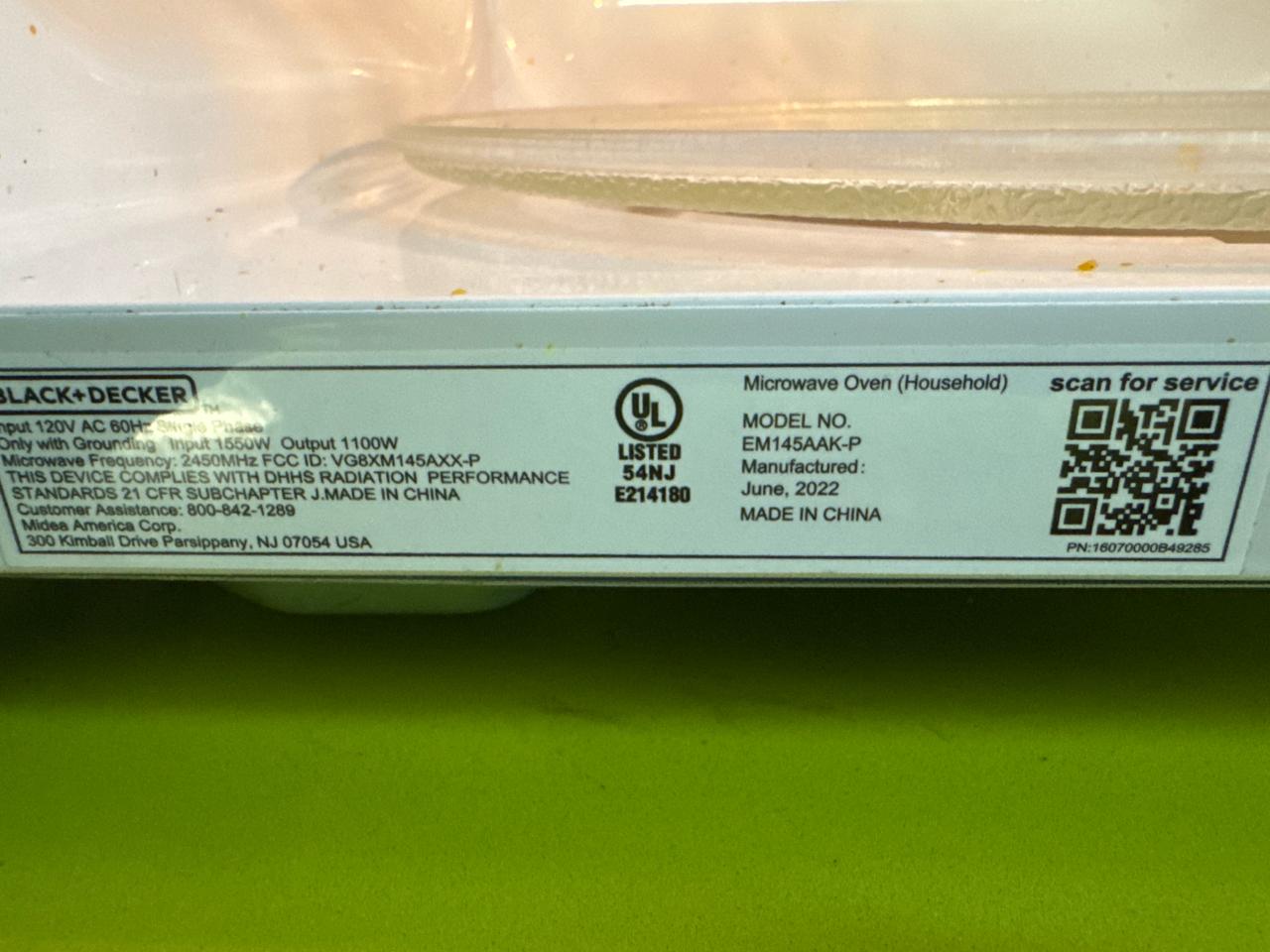 Black+Decker microwave, Model EM145AAK-P , [Loc. Fabrication]