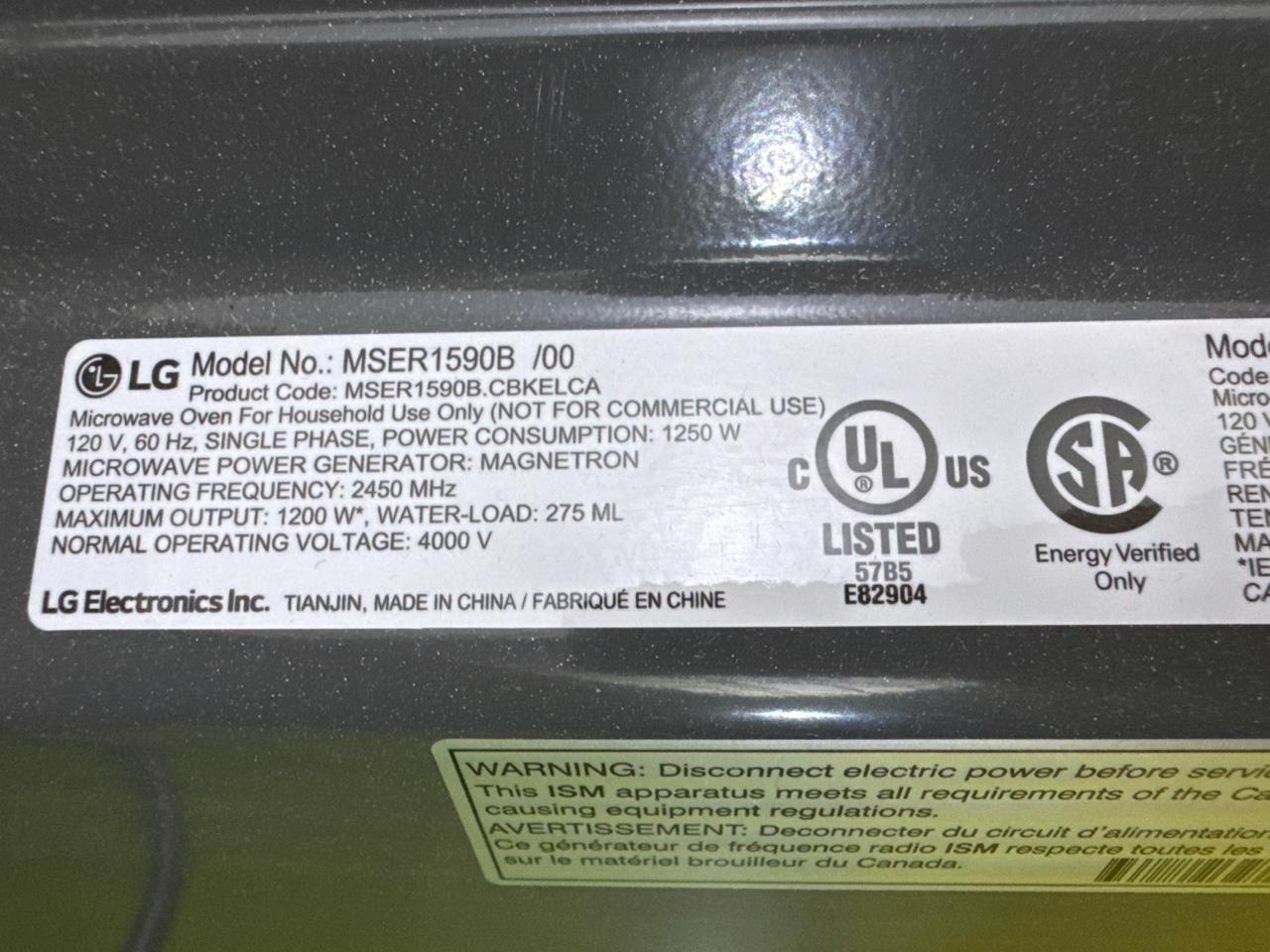 LG Microwave, model MSER1590B, [Loc. Cafeteria Assembly Area]
