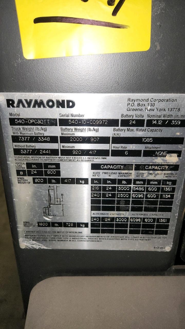 Raymond Stand up order picker, mod. 540-0PC30TT, ser. 540-10C09972, 24V., 3000 lb cap, Scrap for parts, battery not included
