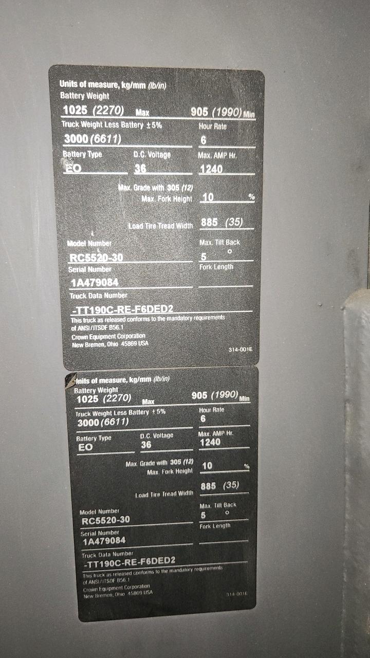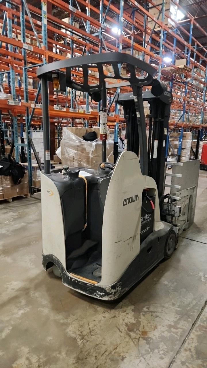 Crown Stand Up Forklift, mod. RC5520-30, ser. 1A479084, 36V., 3000 lb cap, 3286 Hrs., side shift, Comes with Cascade Carton Clamp, cat# 25D-CCS-35Q ser. PTL2131287-1R4, 24\" load center, 2500 lb cap