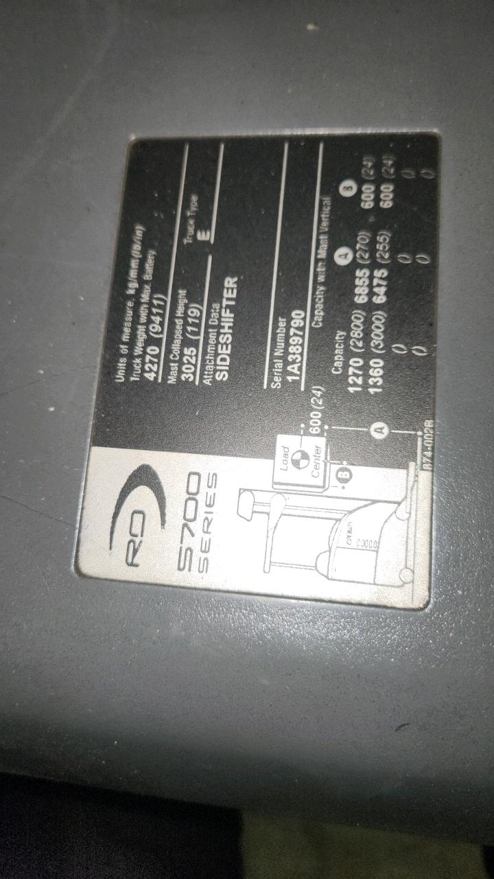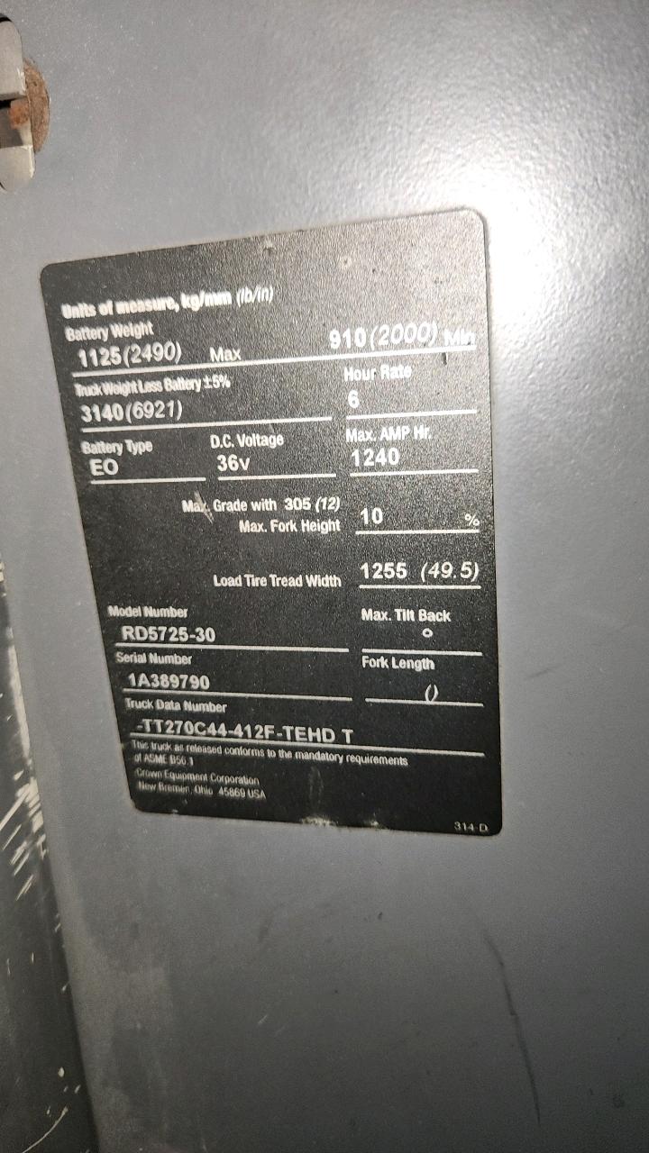 Crown Narrow Aisle Double Deep Reach truck, mod. RD5725-30, ser. 1A389790, Side Shift, 36 V., 3000 lbs cap, 14812 Hrs, under repair