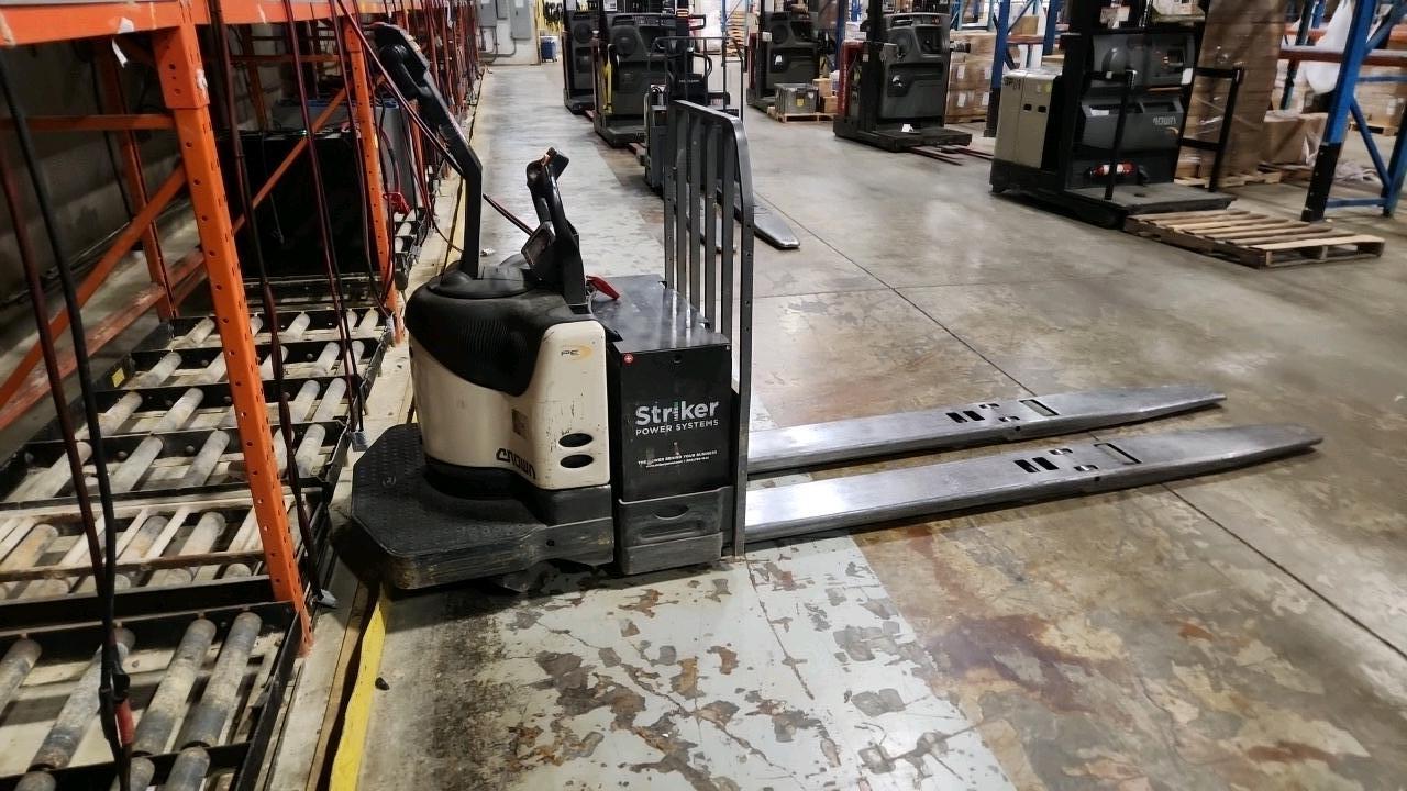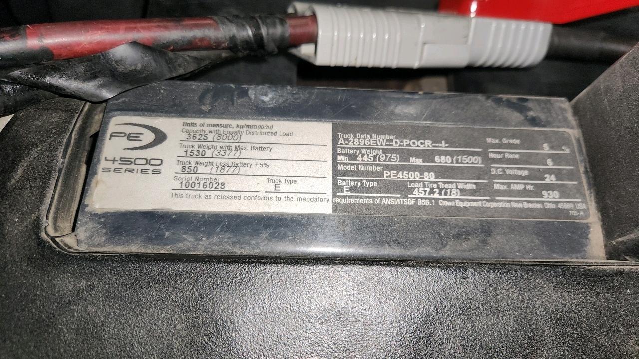 Crown Electric Rider Pallet Jack, mod. PE-4500-80, ser. 10016028, 24 V., 8000 lb @ 24 inches load centre, extra long forks 27\" W x 93\" L, 4365 Hrs.