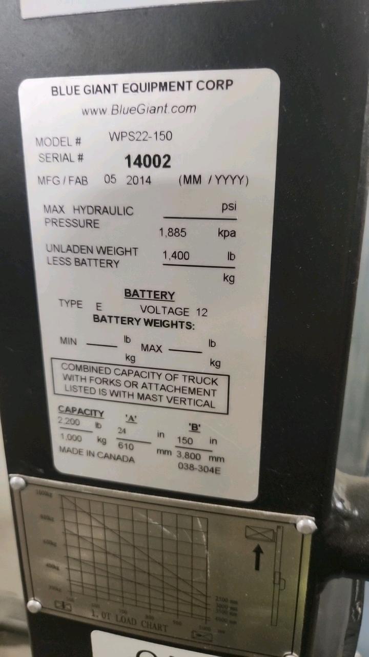 Blue Giant Walking Stacker, Mod. WPS22-150, Ser. 14002, 2200 lbs. cap.