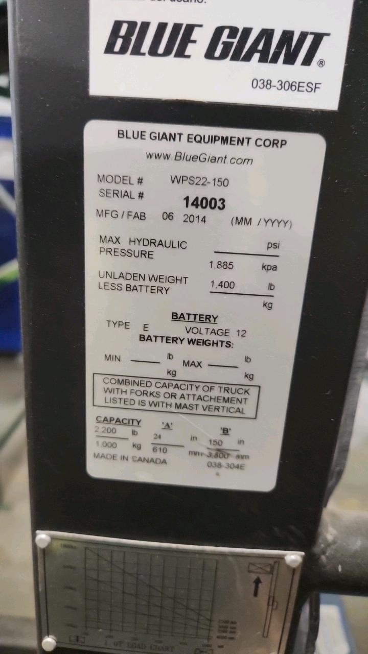 Blue Giant Walking Stacker, Mod. WPS22-150, Ser. 14003, 2200 lbs. cap.
