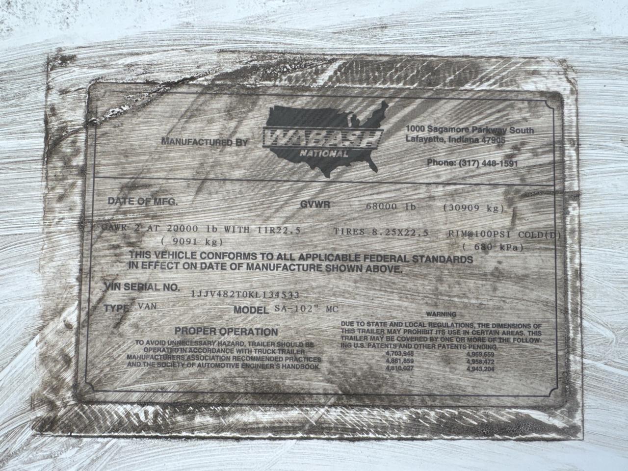 Wabash National Dry Van Trailer, 48 feet, T/A, Mod. SA-102\"?, VIN 1JJV482T0KL134533, Roll up door (1989)