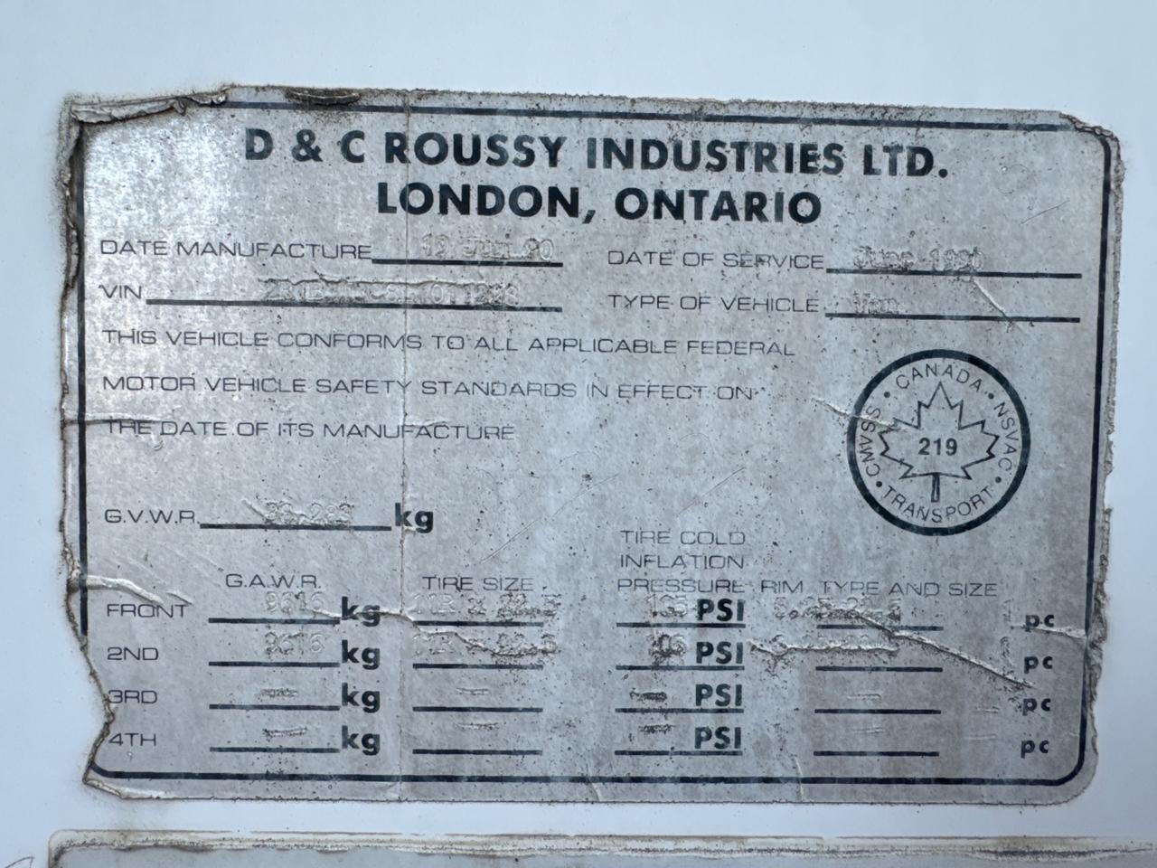 Roussy Dry Van Trailer, 53 feet, T/A, Mod. VAN, VIN, Roll up door (1990)