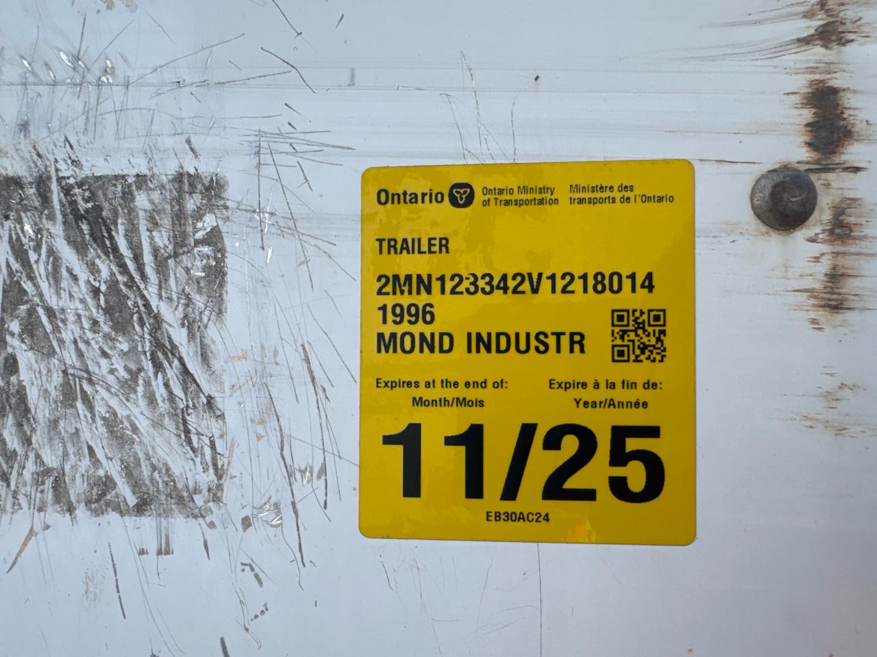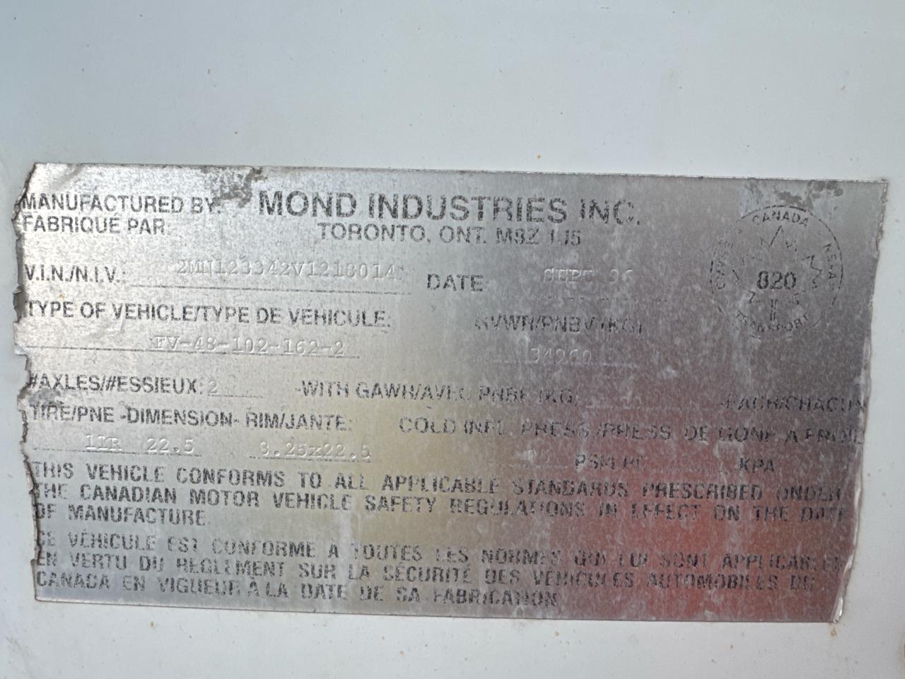 Mond Dry Van Trailer, 48 feet, T/A, Mod. FV-48-102-162-2, VIN 2MN123342V1218014, Roll up door (1996)