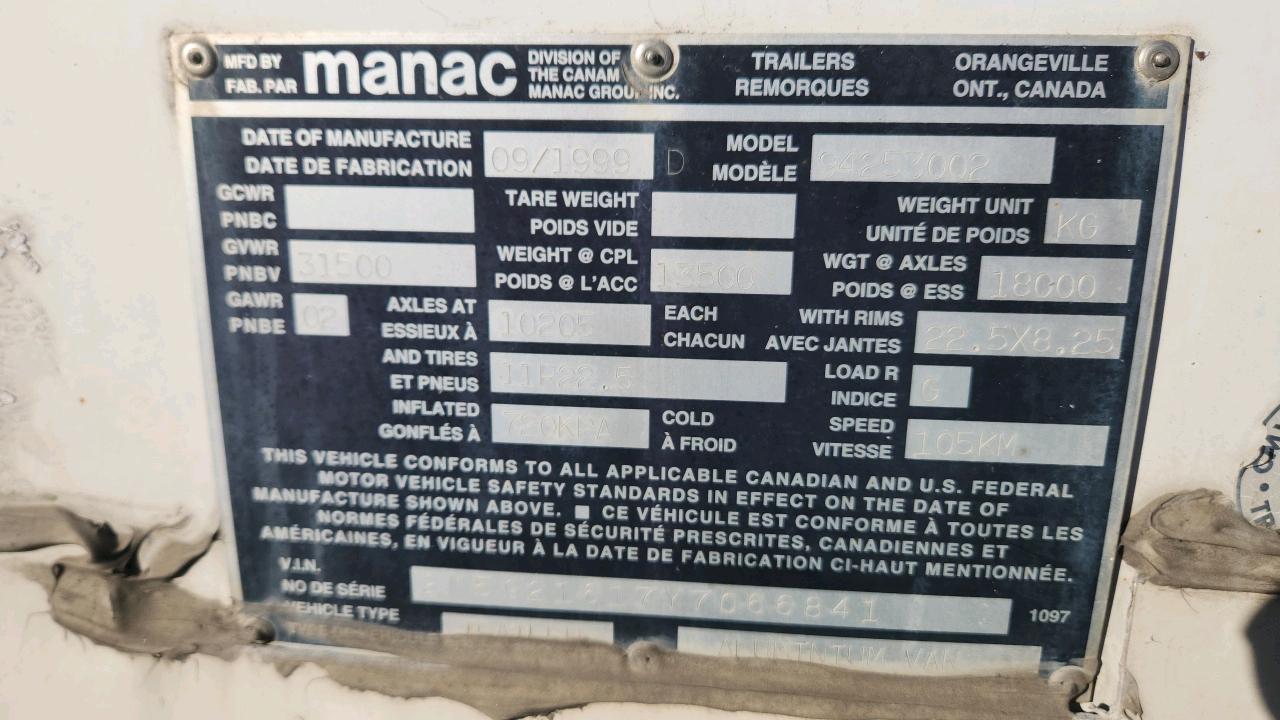 Manac Dry Van Trailer, 53 feet, T/A, Mod. 94253002, VIN. 2M5921617Y7066841, Roll up door, (1999), Delivery