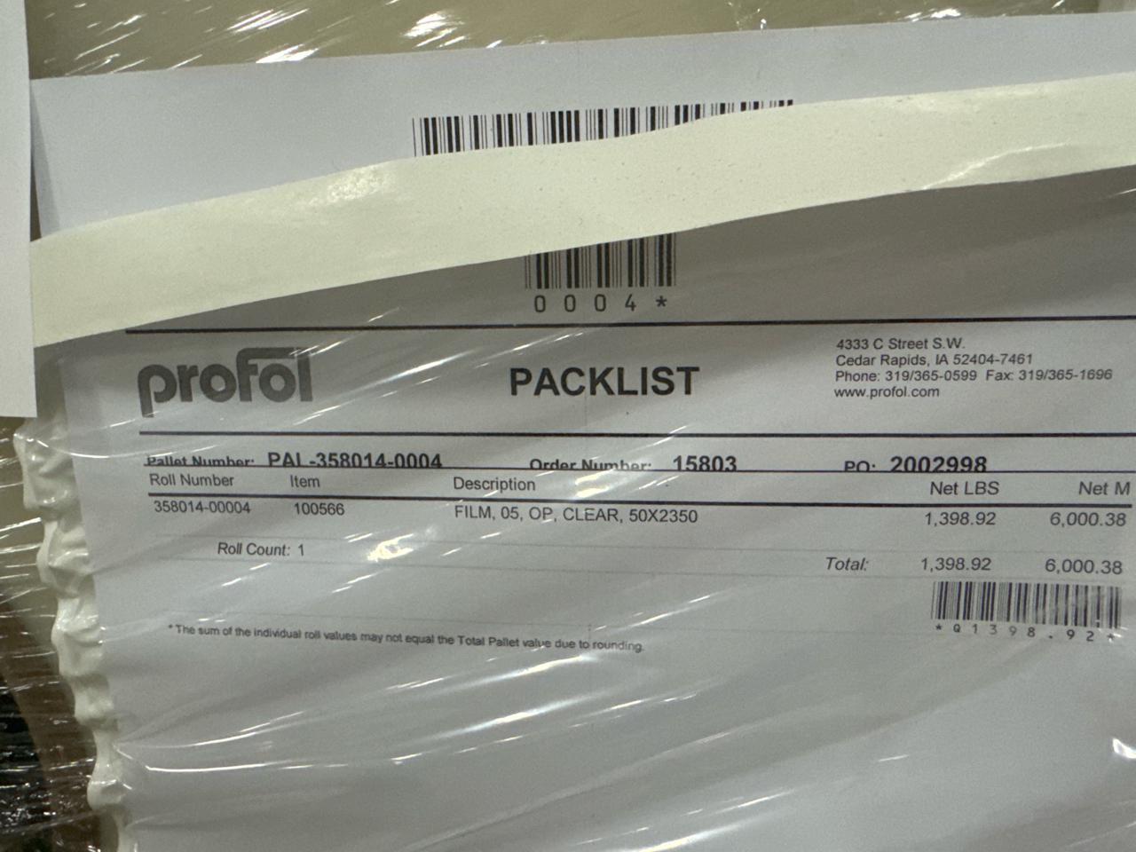 (6 rolls x 6000 m = approx. 36000 m) Profil Film, mod. 05, OP, CLEAR, 50 um thick x 2350 mm wide [Loc. Cambridge]