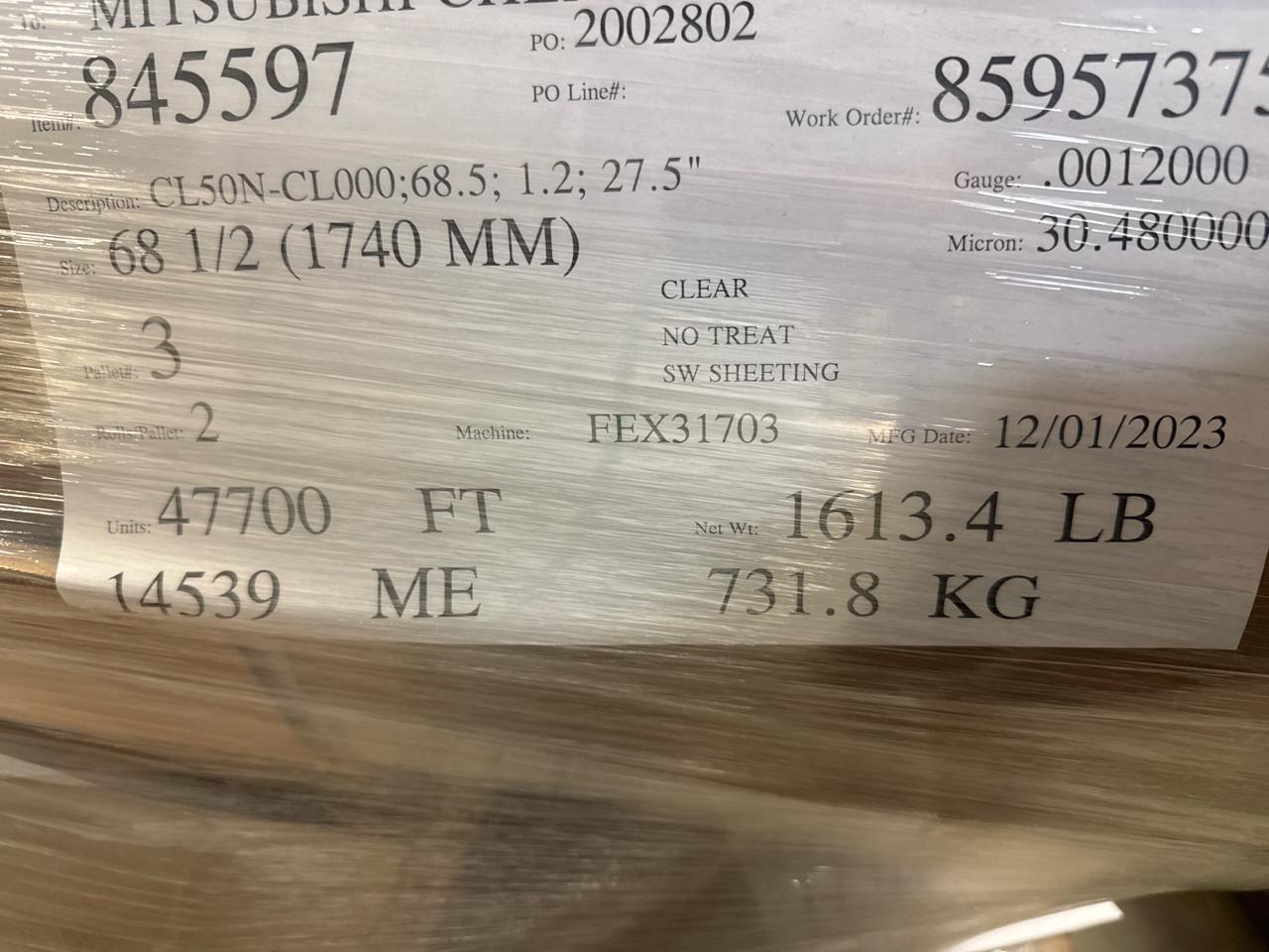 (6 rolls = approx. 76000 m) Berry Plastic film, mod. CL504N-CL000;68.5;1.2;27.5 in. gauge 0.0012, 30.48 um [Loc. Cambridge]