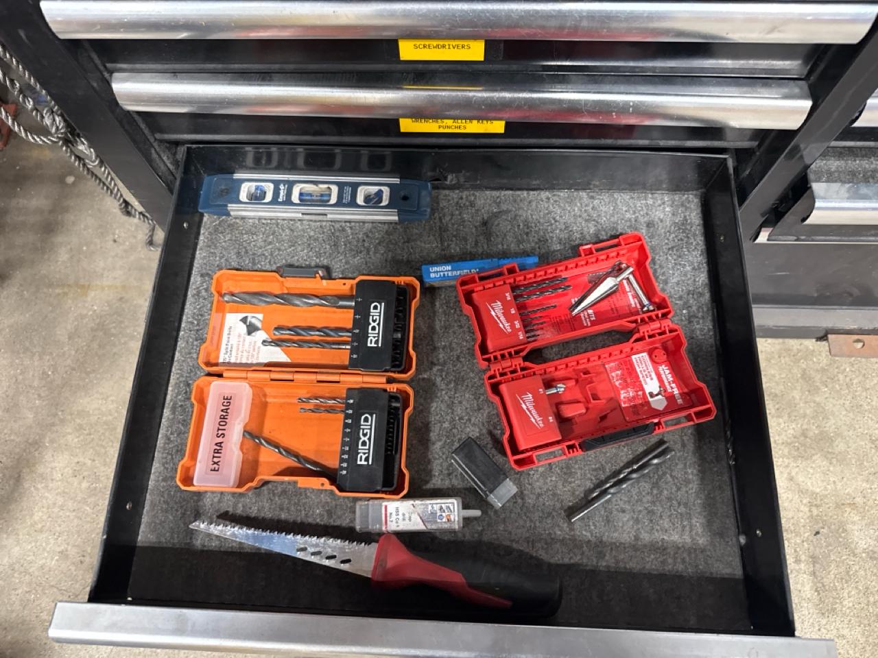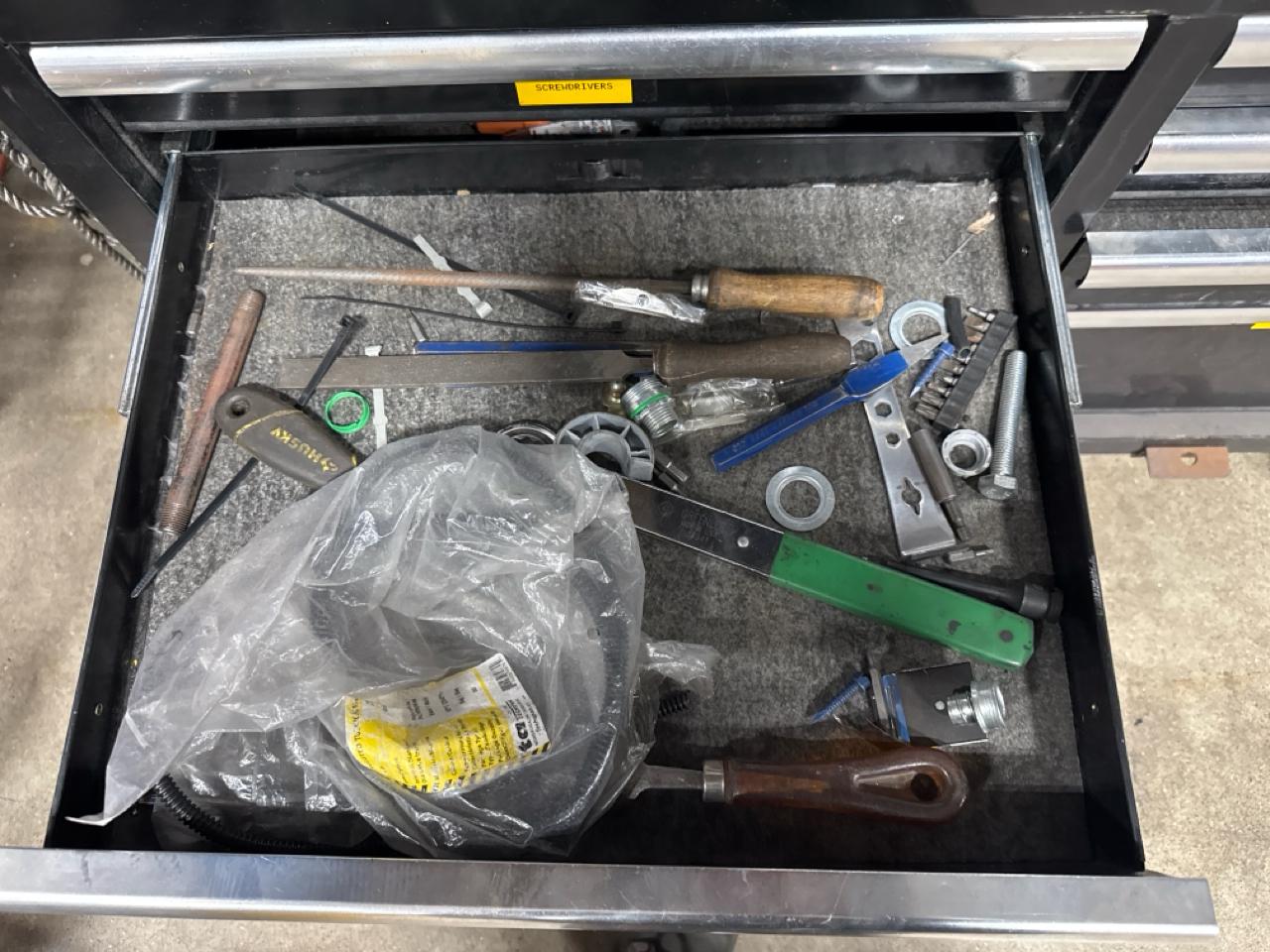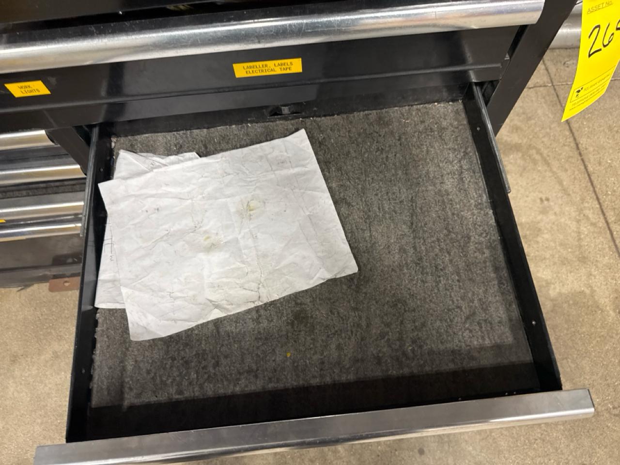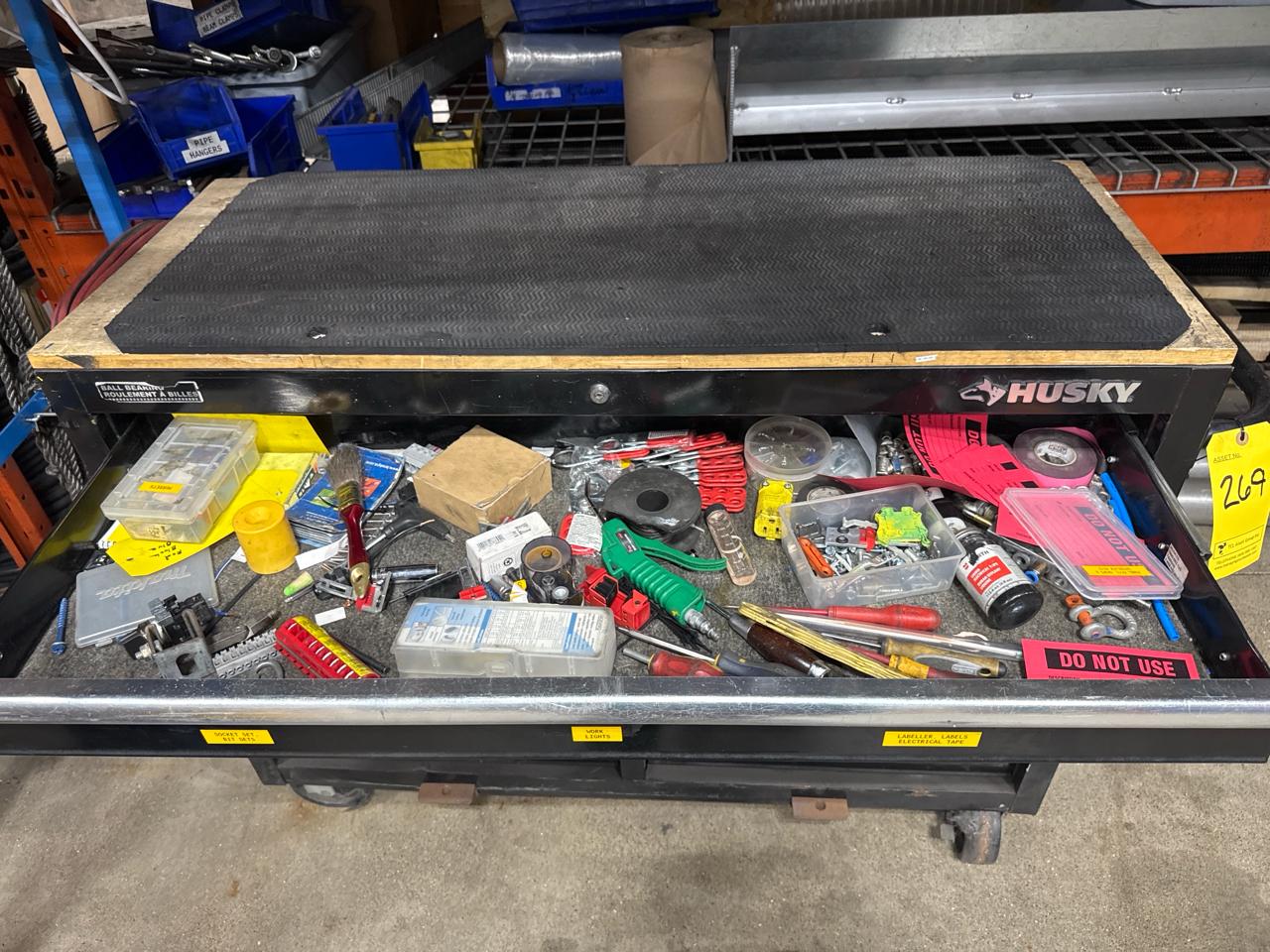 Husky mobile work bench w/ butcher block top c/w contents (no key)