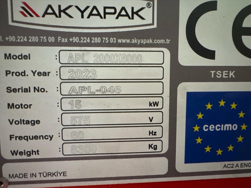 2023 Akyapak Metalworking Technologies - APL 2000mm x 6000mm Plasma Cutting Machine, S/N APL-046, (1) Vanterm Dust Collector, Model PL-6000, Serial 2306-161-304, (1) Hypertherm Plasma Cutting System, Model XPR 300, (1) Control Panel