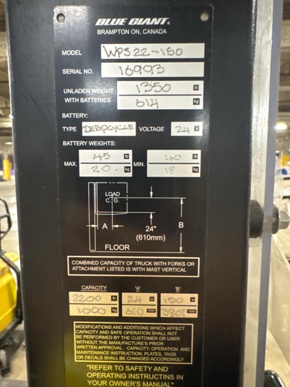 Blue Giant Walking Stacker, mod. WPS22-150, Ser. 16993, 2200 lbs. cap., 24V