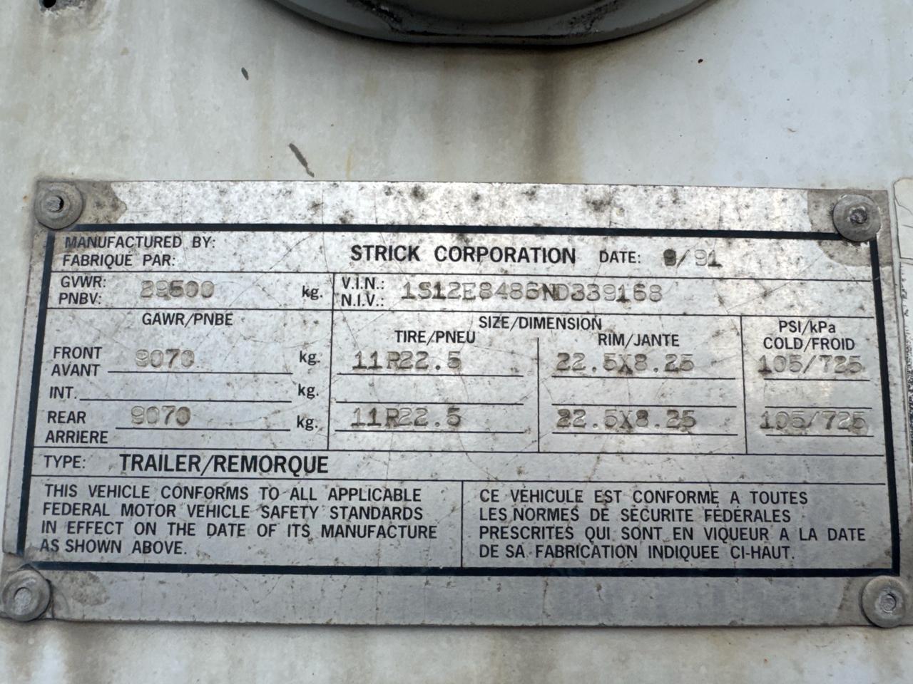 Strick Dry Van Trailer, 48 feet, T/A, Mod. TRAILER/REMORQUE, VIN. 1S12E8486ND339168, Roll up door, (1991), Storage