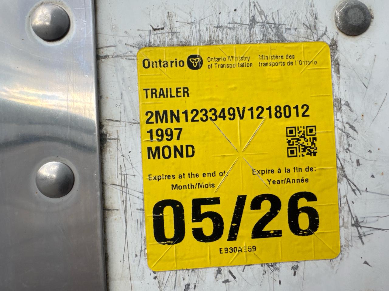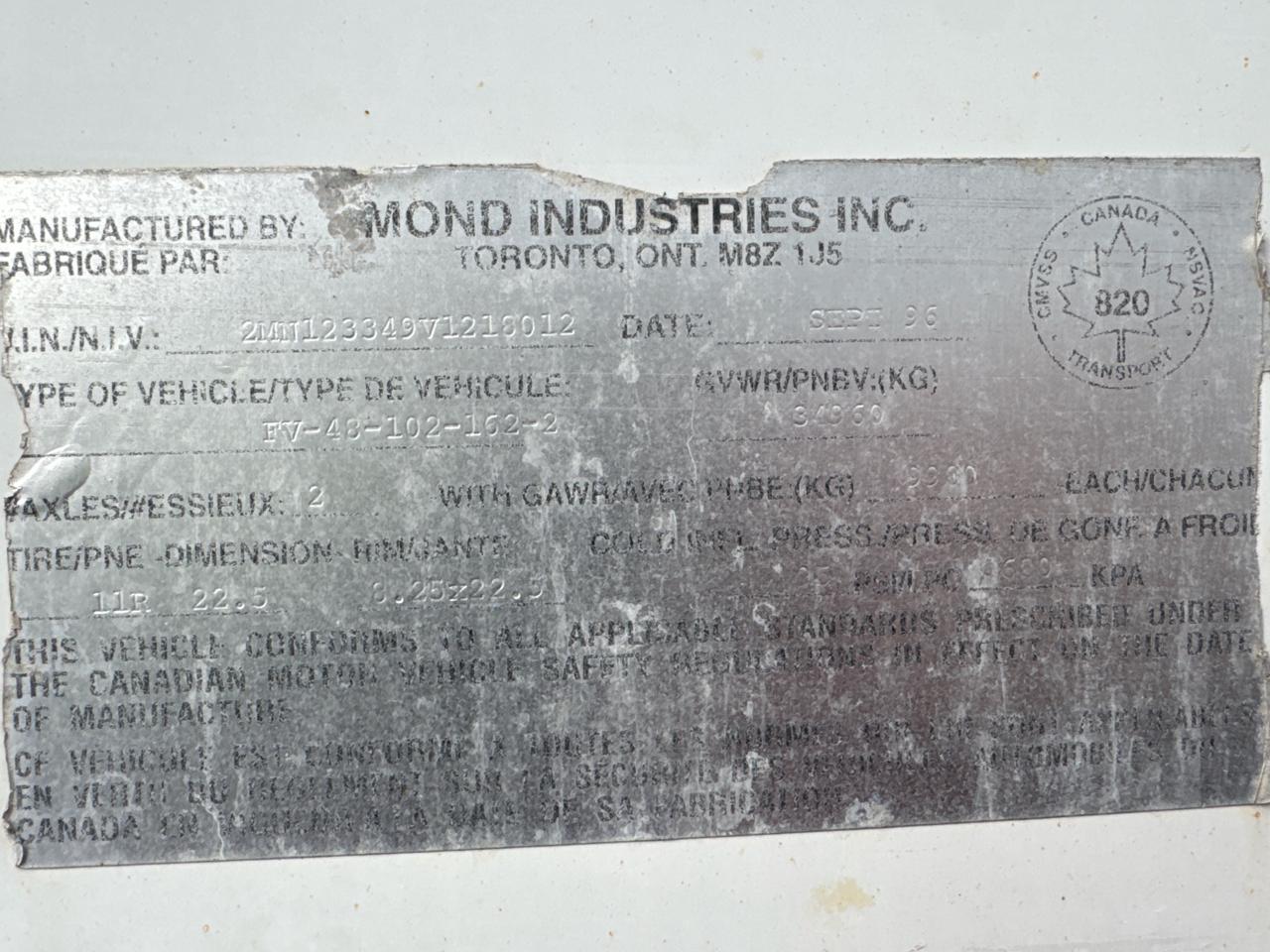 Mond Dry Van Trailer, 48 feet, T/A, Mod. FV-48-102-162-2, VIN. 2MN123349V1218012, Roll up door, (1996), Delivery