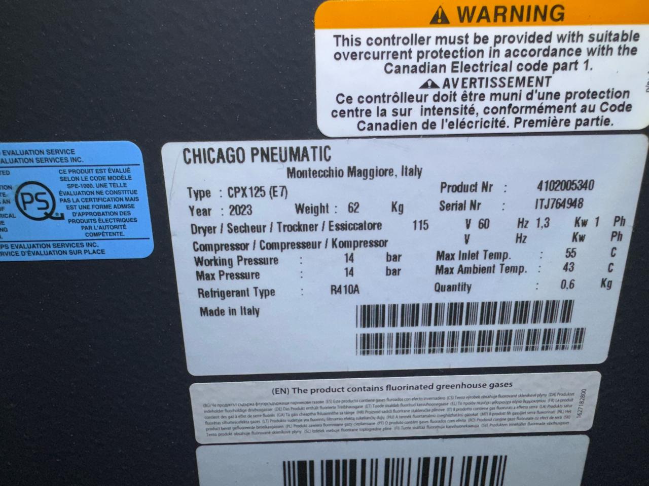 Chicago Pneumatic air dryer, mod. CPX 125 (E7), ser. no. ITJ764948 (2023)