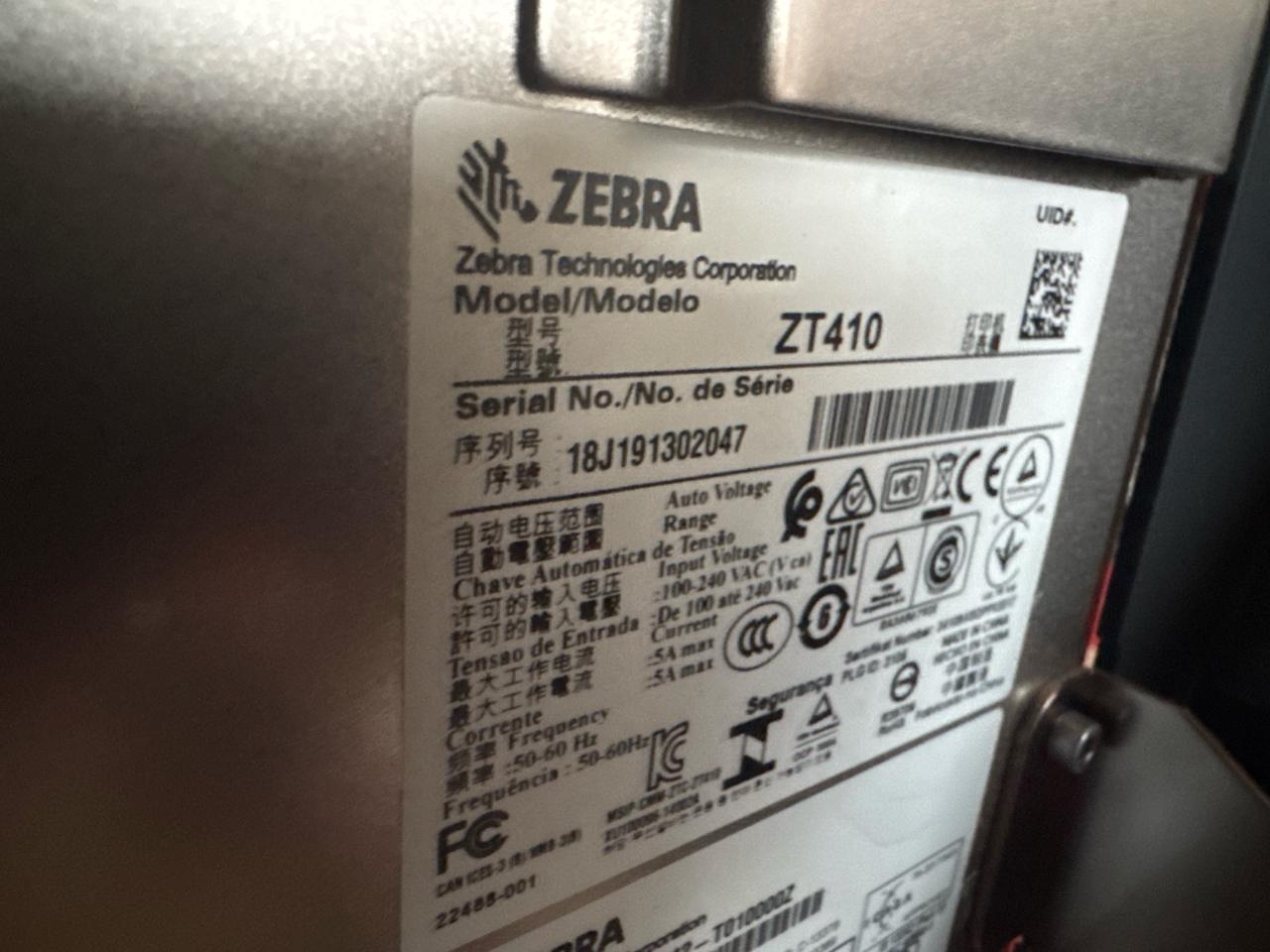 Zebra Industrial Thermal Transfer Label Printer, mod. ZT410, ser. no. 18J191302047 [Loc. Barn - Main Plant]