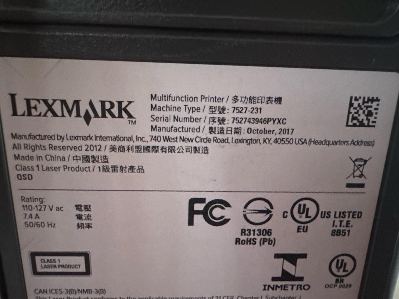 Lexmark Multifunction Laser Printer, mod. 7527-231, ser. no. 7527J43946PYXC, Print, Copy, Scan, Fax [Loc. Barn - Main Plant]