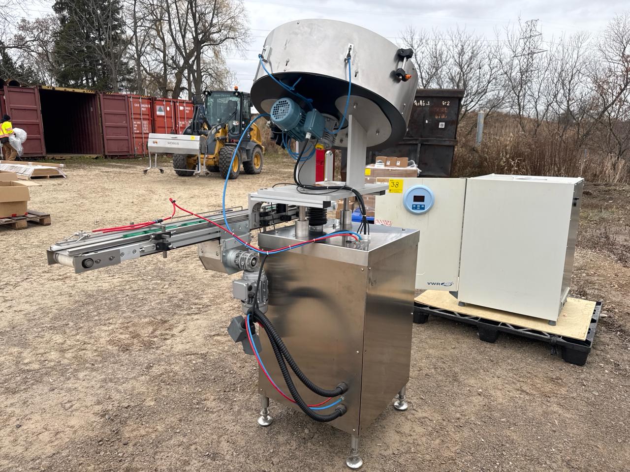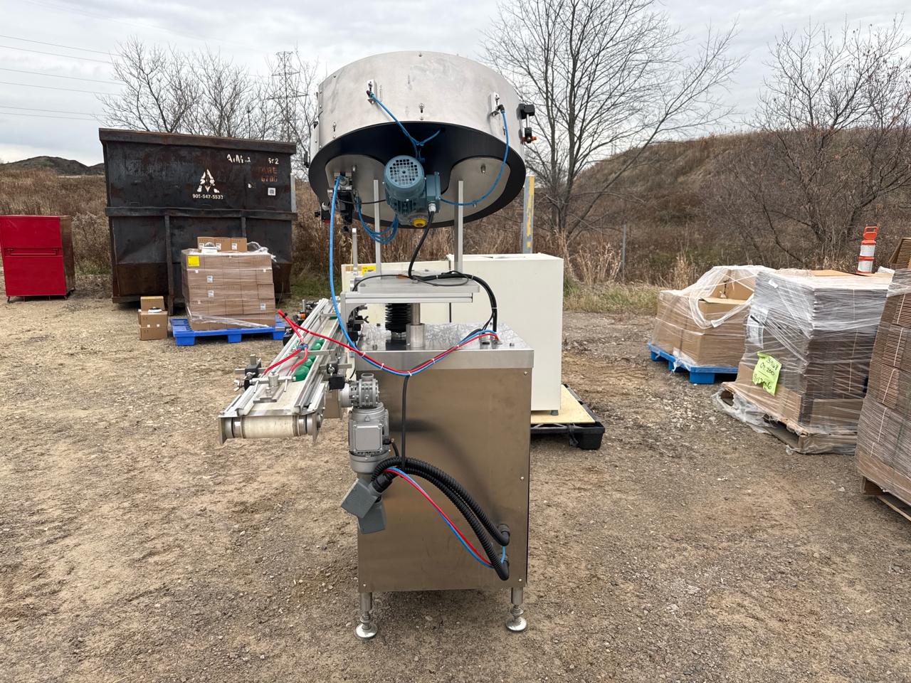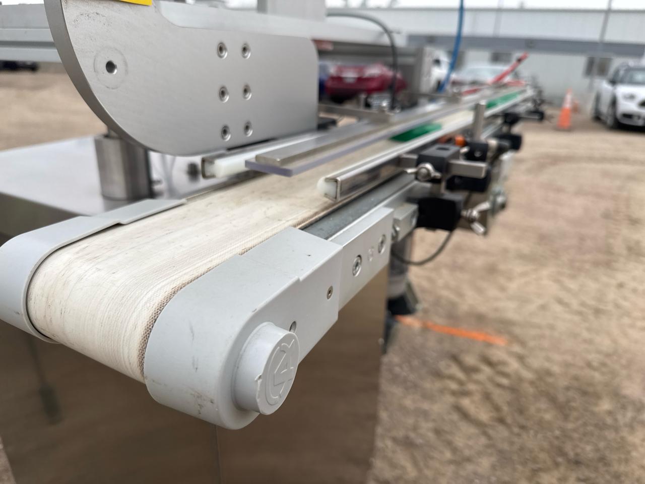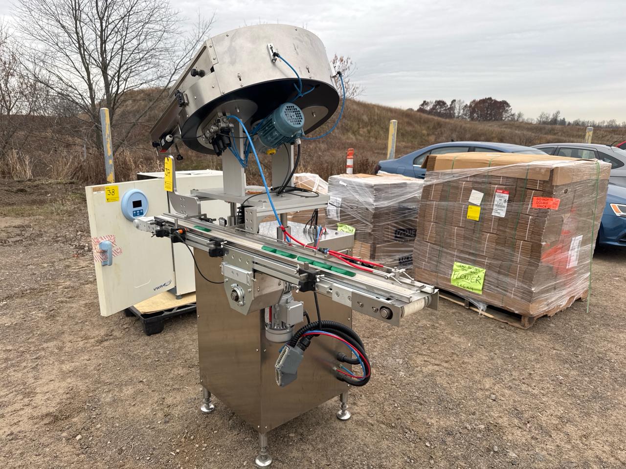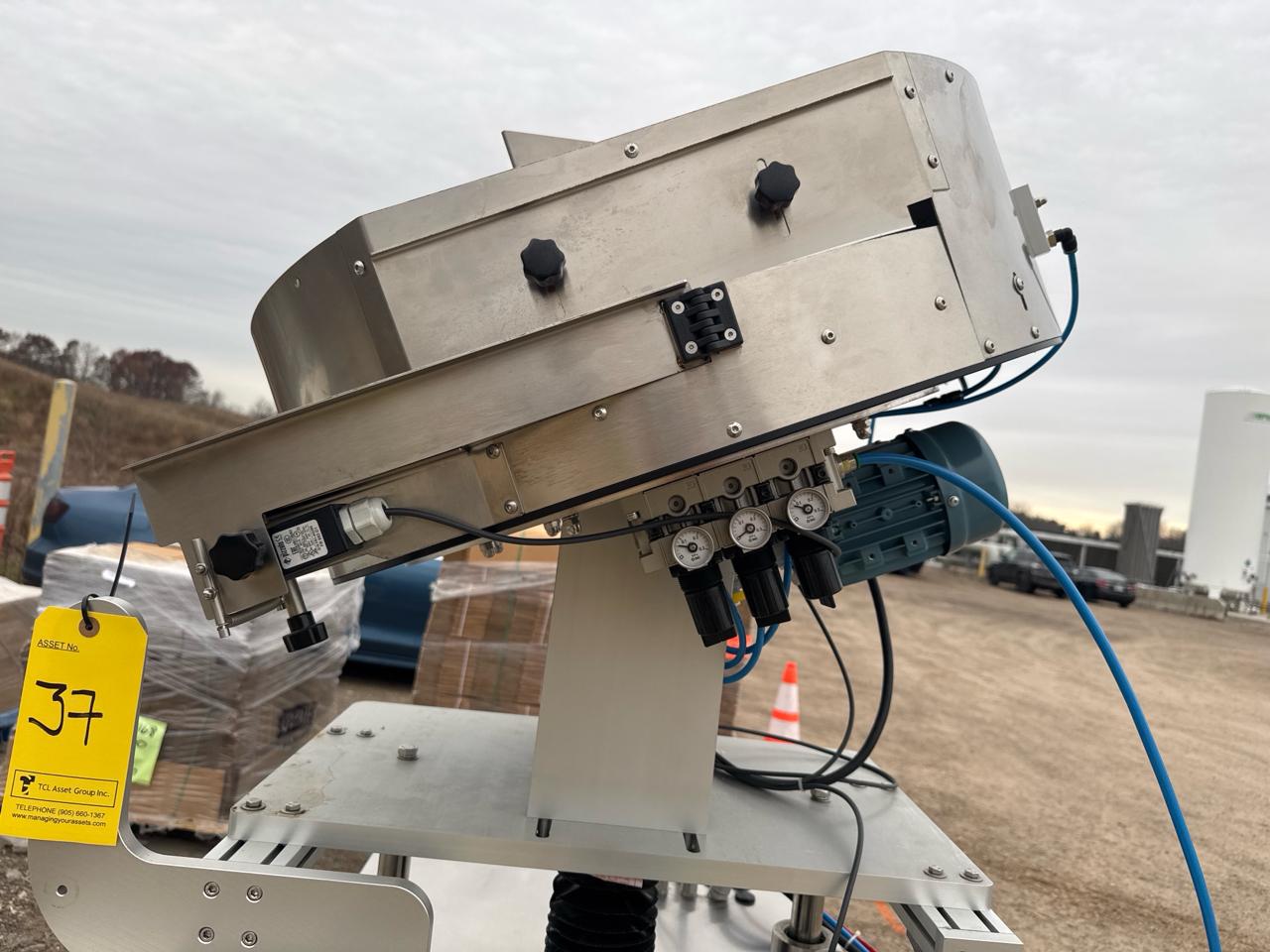 Rotary Cap Sorter/Feeder, stainless steel w/ power belt conveyor, 3 in. x 5 ft. [Loc. Sea Containers - Main Plant]