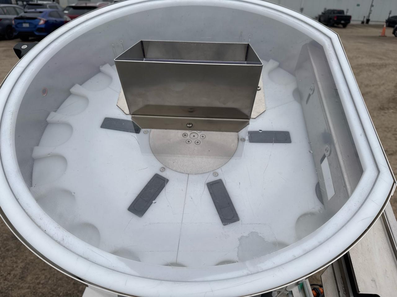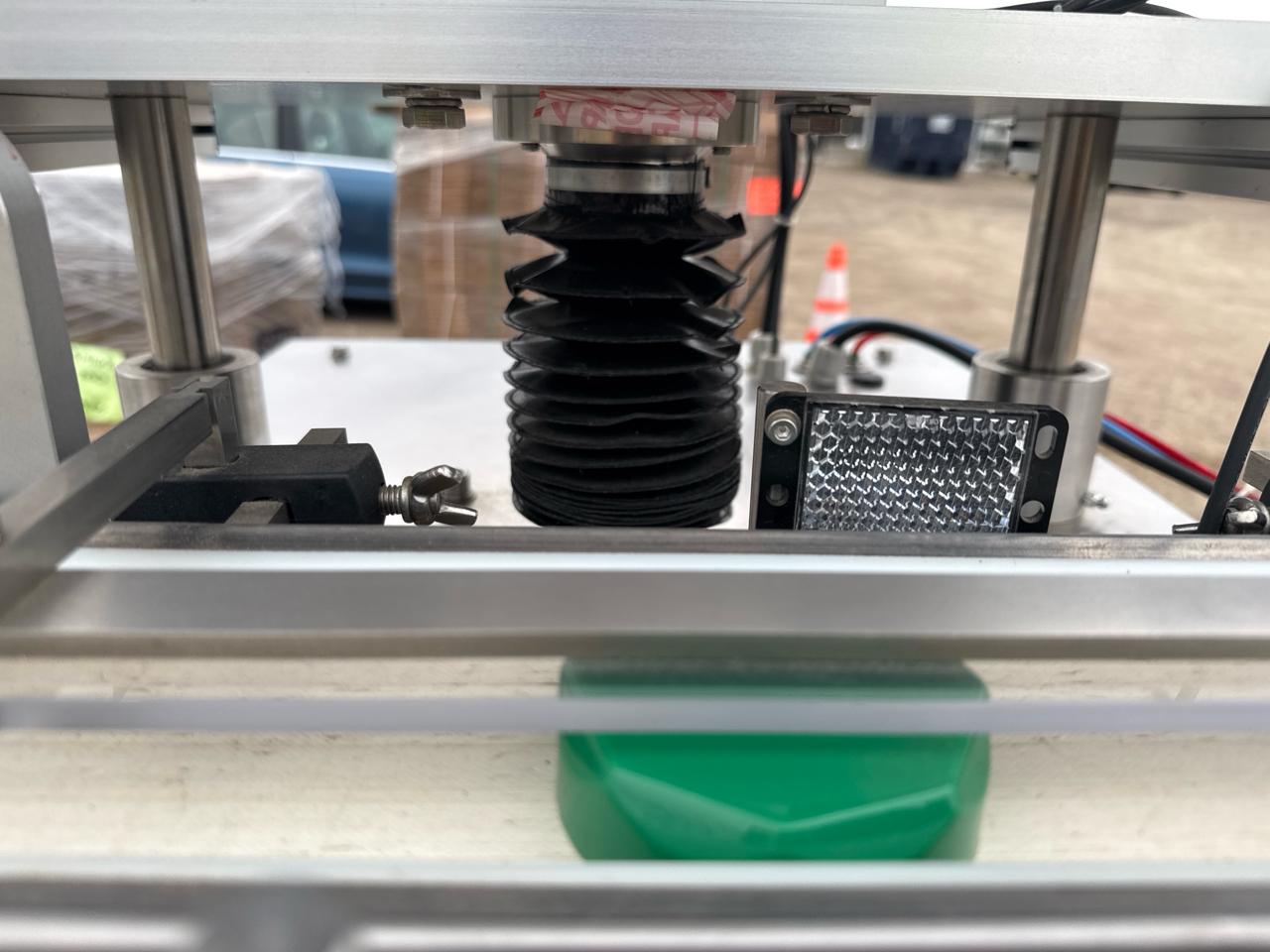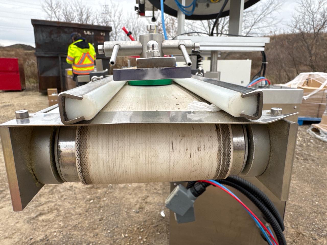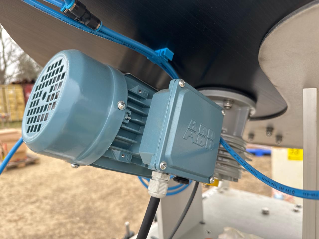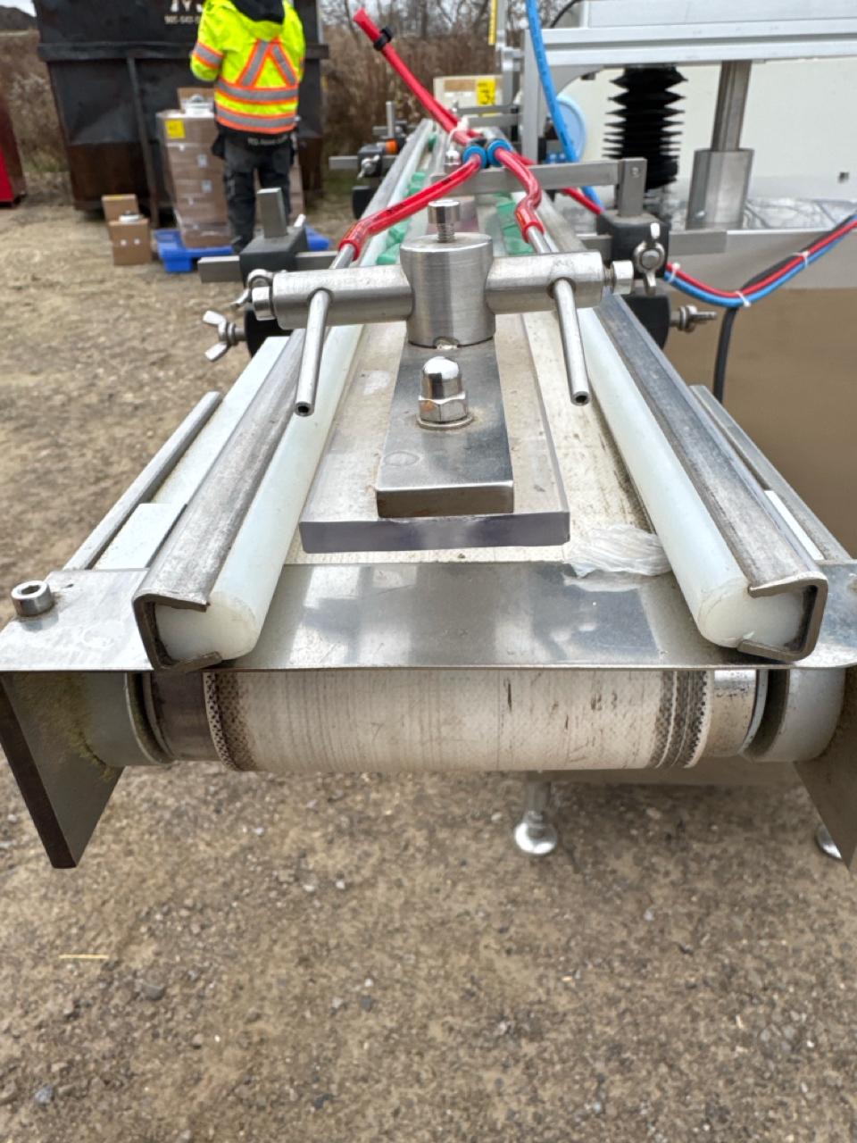Rotary Cap Sorter/Feeder, stainless steel w/ power belt conveyor, 3 in. x 5 ft. [Loc. Sea Containers - Main Plant]
