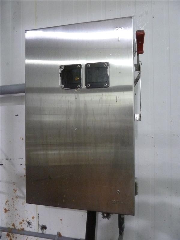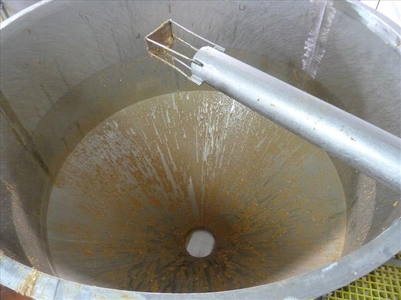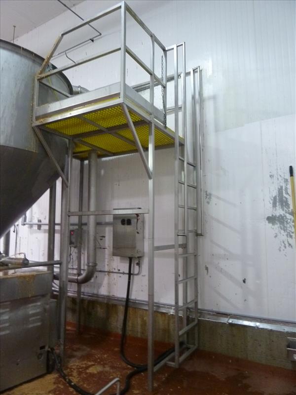 Hopper (no. 1 East), stainless steel, approx. 6600 kg cap., pressure gate, c/w stainless steel elevated work platform