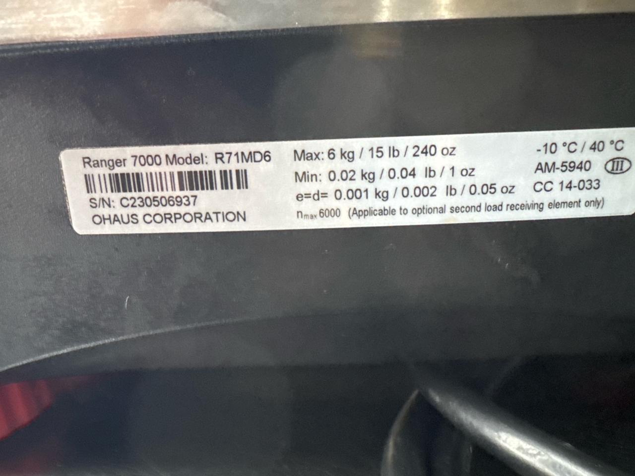 Ohaus Ranger 7000M digital bench scale, mod. R71MD6, 6 kg - 0.02 kg cap., 11 in. x 11 in. stainless steel platform [Loc. Sea Containers - Main Plant]