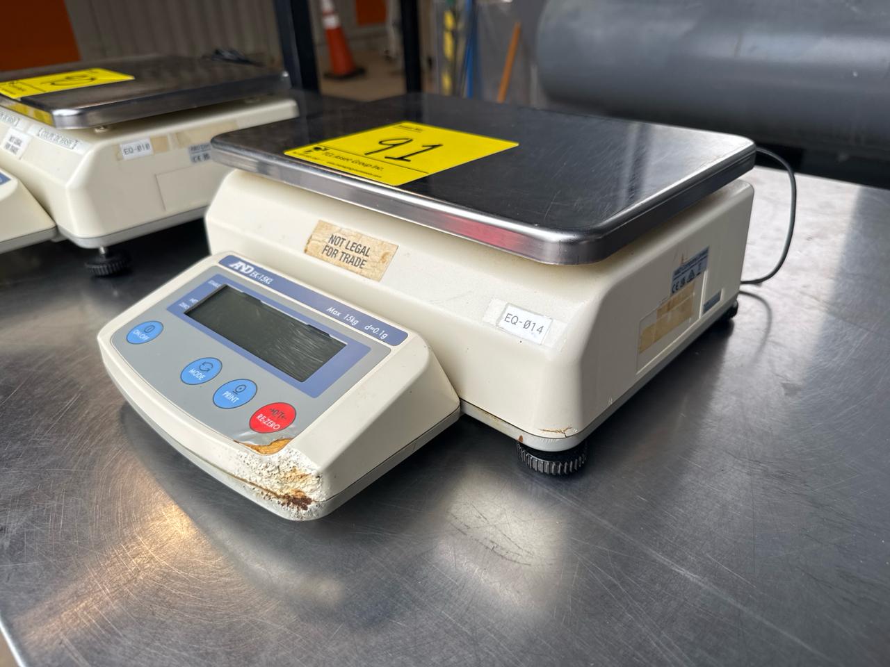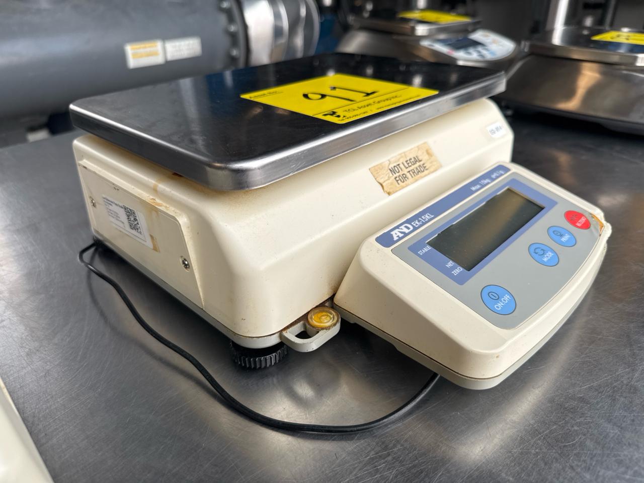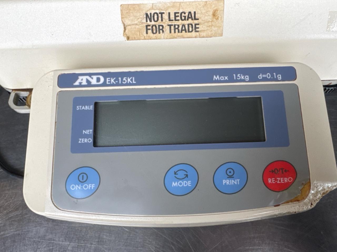 AND digital bench scale, mod. EK-15KL, 15 kg - 0.1 g cap., 8 in. x 12 in. stainless steel platform [Loc. Sea Containers - Main Plant]