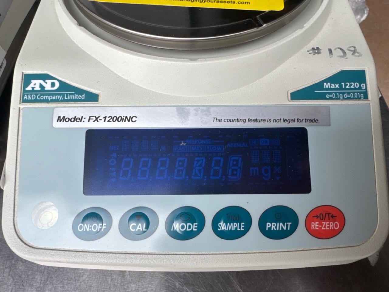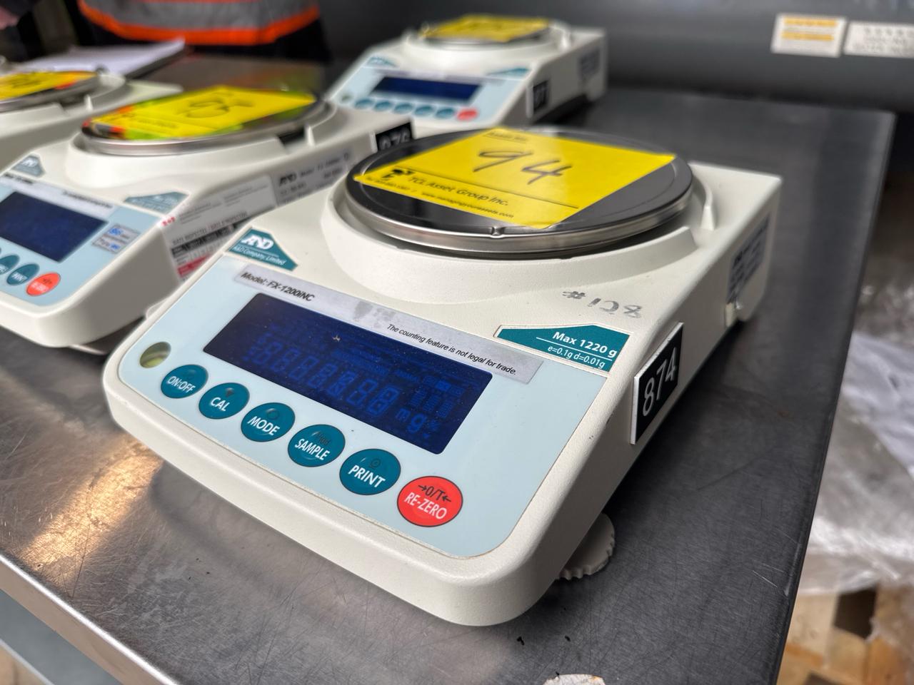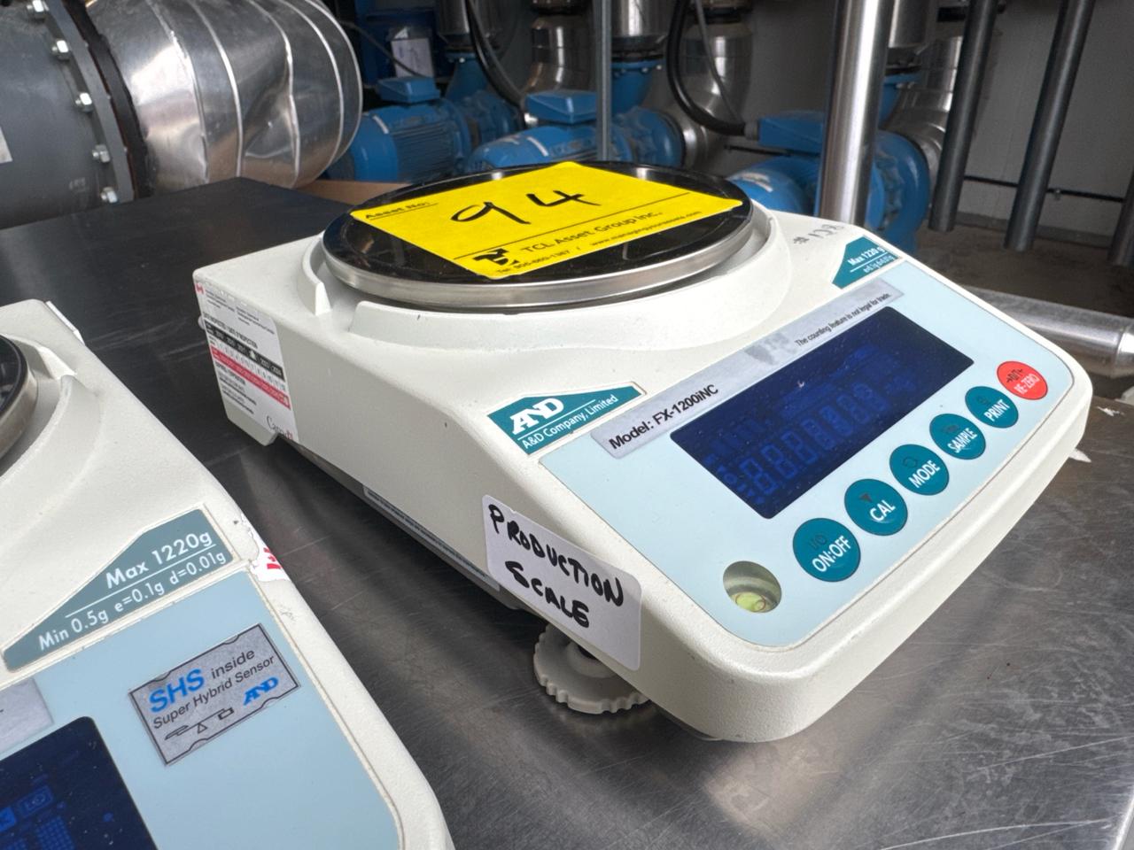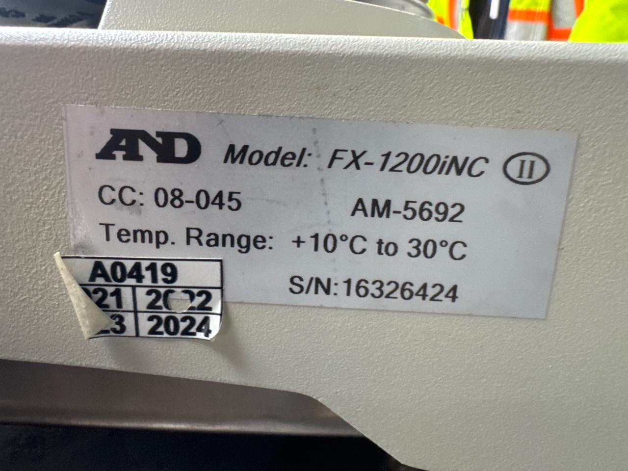 AND digital bench scale, mod. FX-1200 iNC, 13100 g - 0.01 g cap., 5 in. x 5.5 in. stainless steel platform [Loc. Sea Containers - Main Plant]