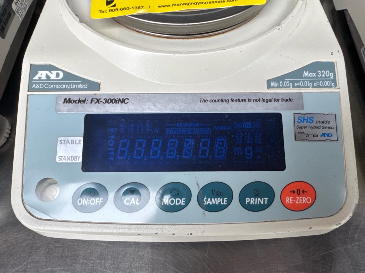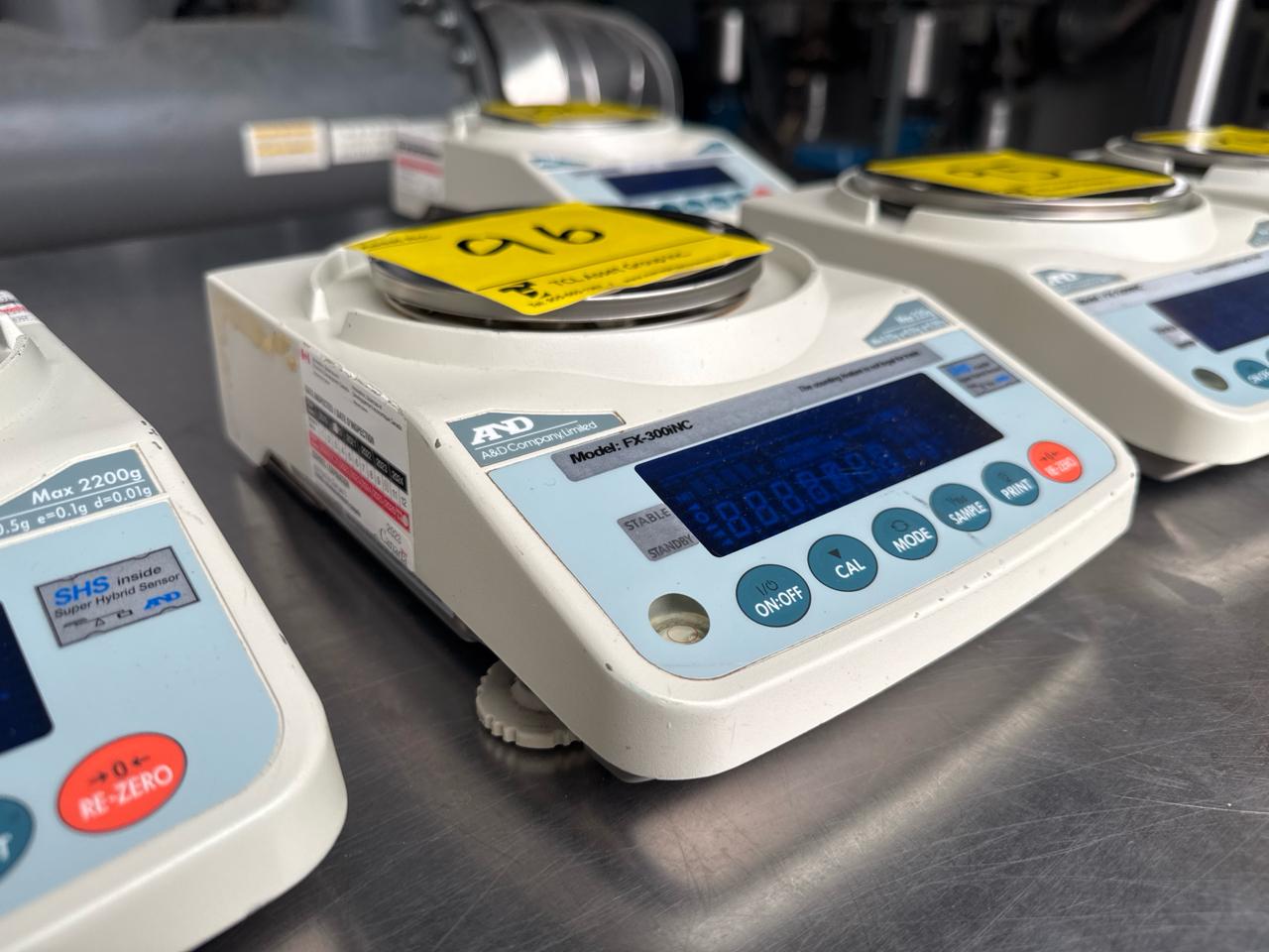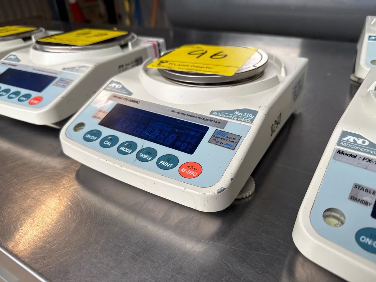 AND digital bench scale, mod. FX-1200 iNC, 13100 g - 0.01 g cap., 5 in. x 5.5 in. stainless steel platform [Loc. Sea Containers - Main Plant]