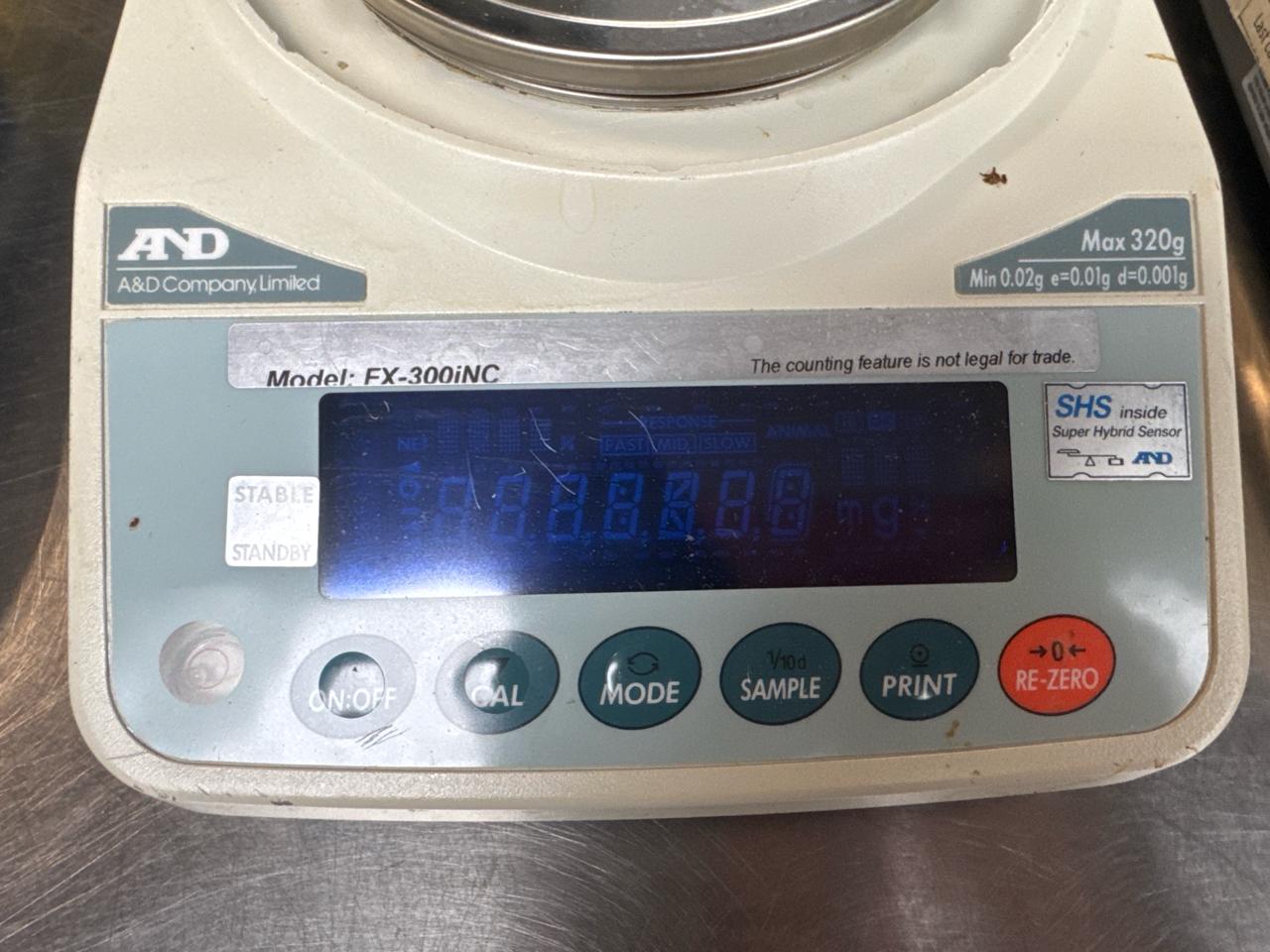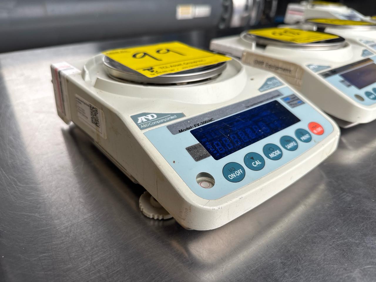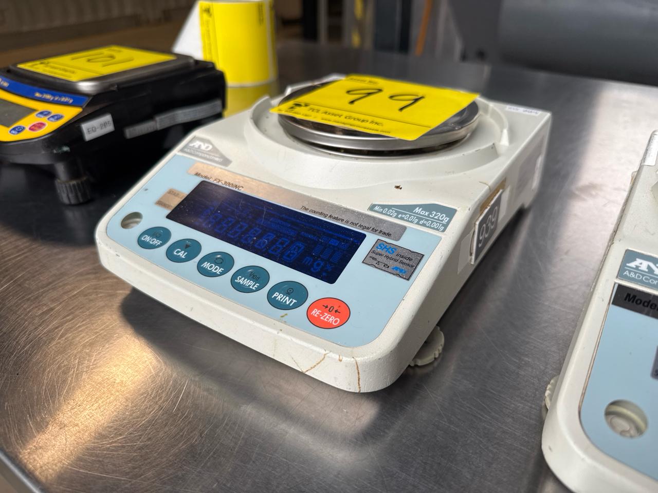 AND digital bench scale, mod. FX-1200 iNC, 13100 g - 0.01 g cap., 5 in. x 5.5 in. stainless steel platform [Loc. Sea Containers - Main Plant]