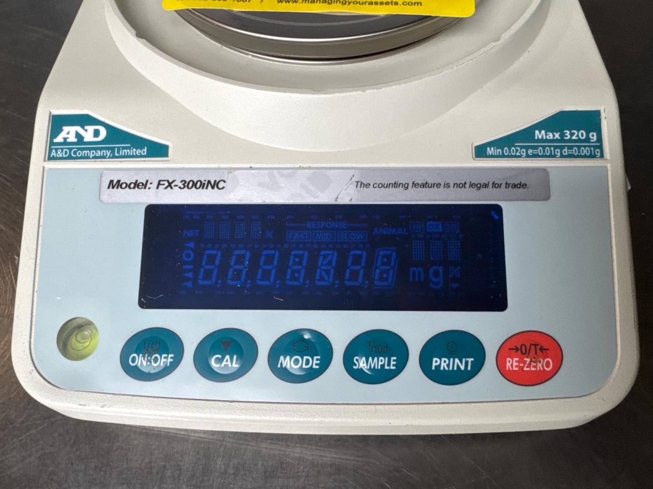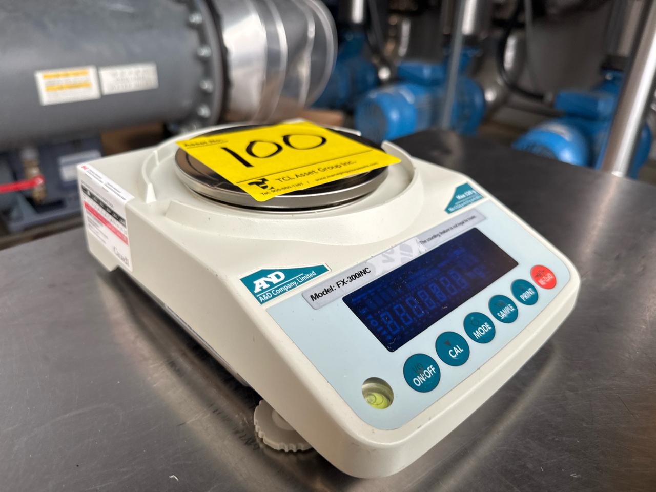 AND digital bench scale, mod. FX-1200 iNC, 13100 g - 0.01 g cap., 5 in. x 5.5 in. stainless steel platform [Loc. Sea Containers - Main Plant]
