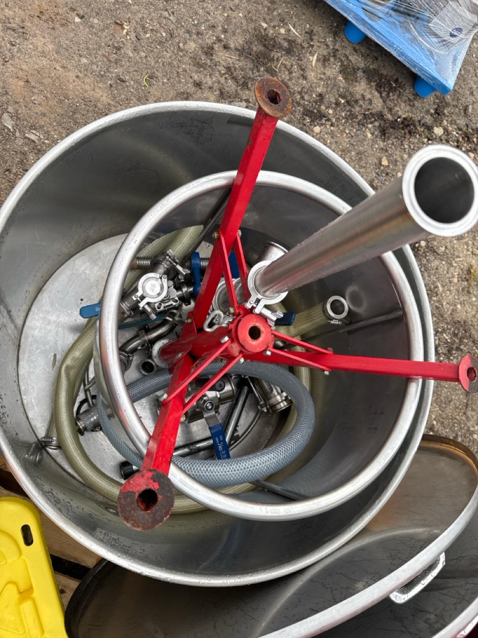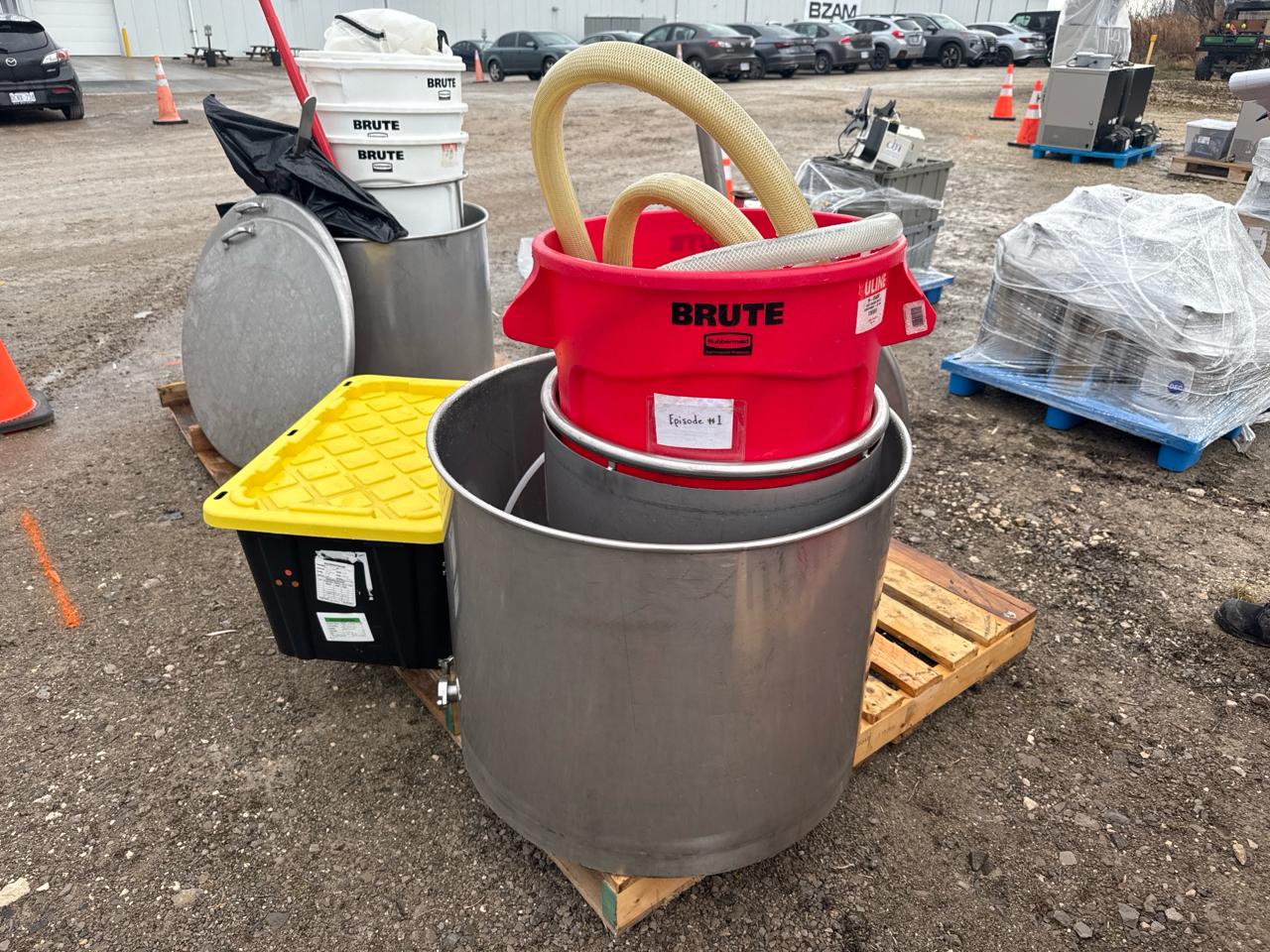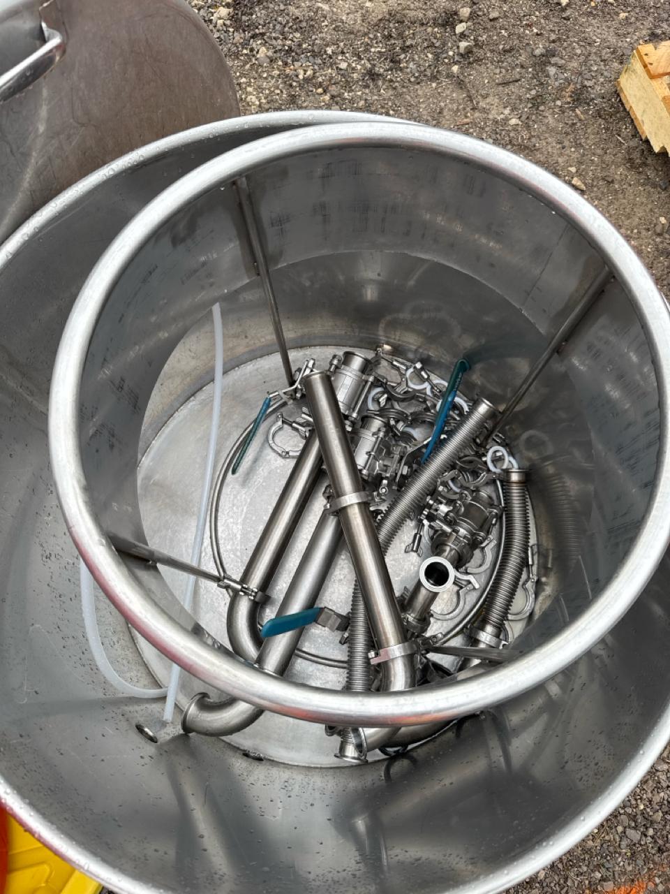 (2) drums, stainless steel, 32 in. dia. x 46 in., bottom discharge c/w misc. hose, valves, etc. (Subject to Confirmation. Winner will be determined by the bid Lot104 vs. sum of bids of Lots 105 - 110, whichever is higher) [Loc. Sea Containers - Main Plant]
