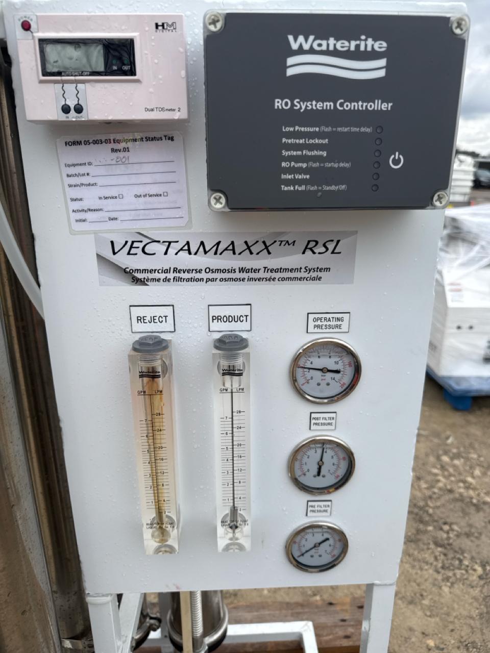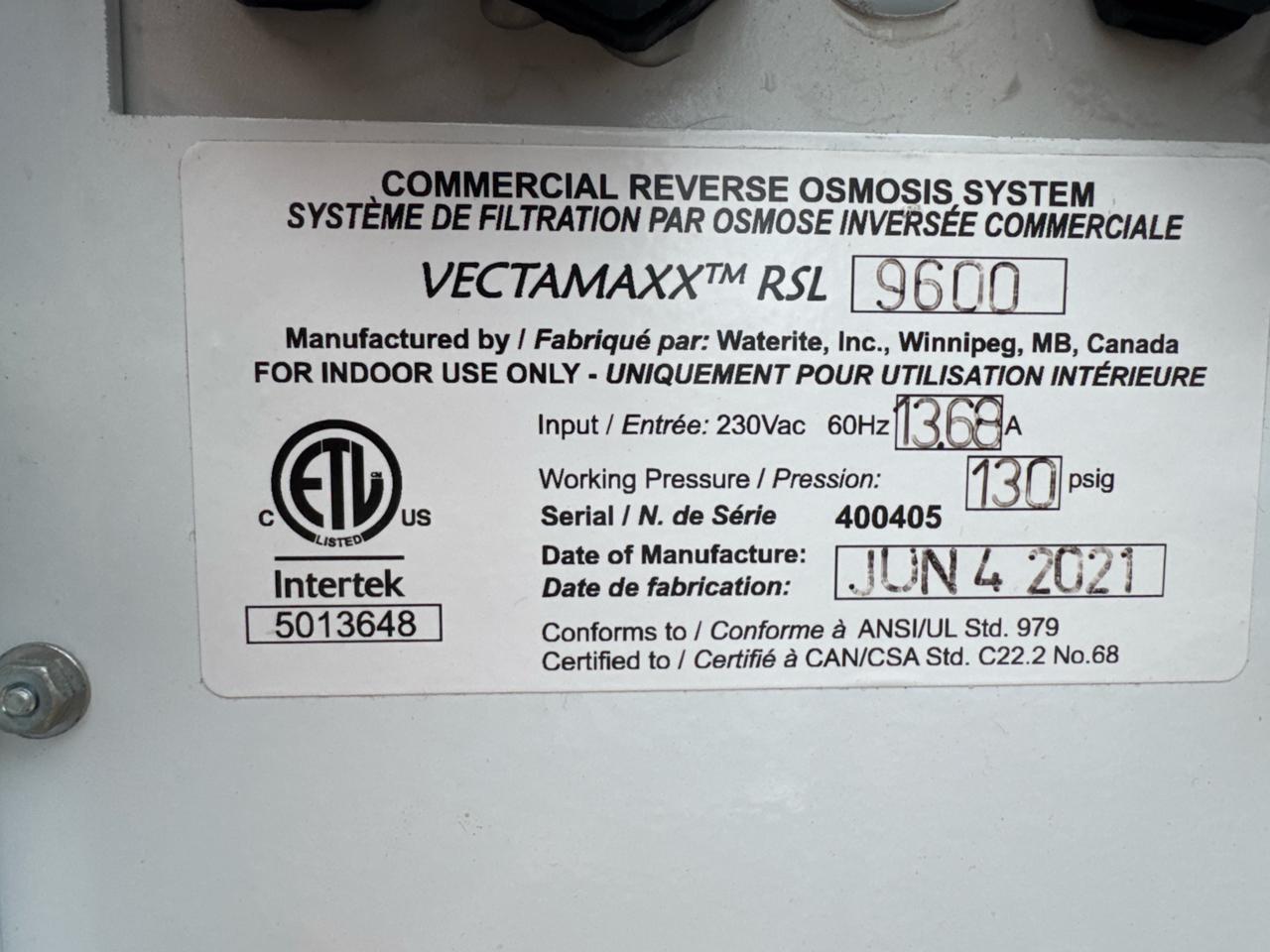 Commercial System RO (Reverse Osmosis) System, mod. Vectamaxx RSZ9600 (2021) c/w WaterRite controller, FL7 22 gal. filter and (2) LFQ7 116L/min. diaphragm pumps [Loc. Sea Containers - Main Plant]
