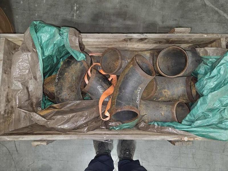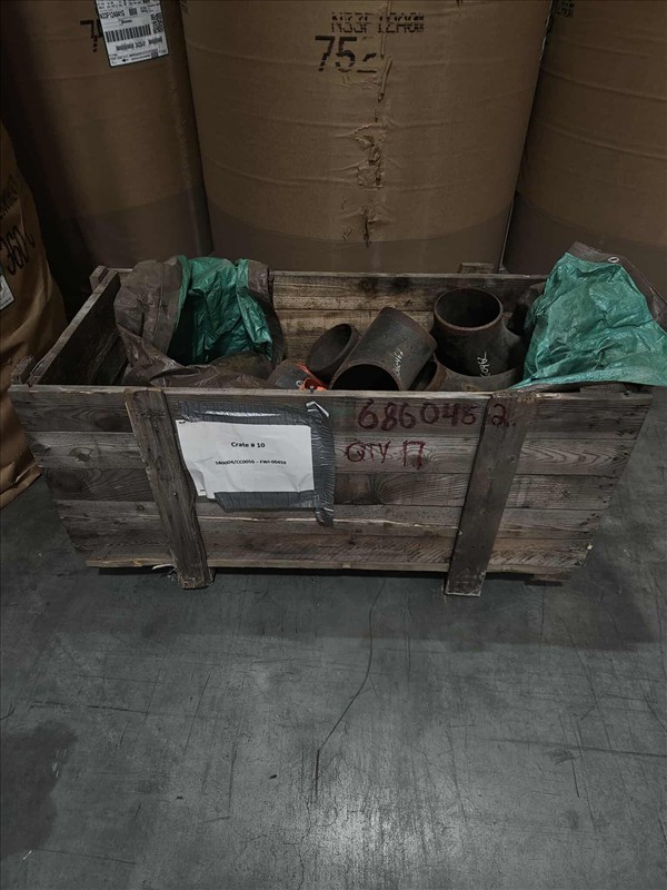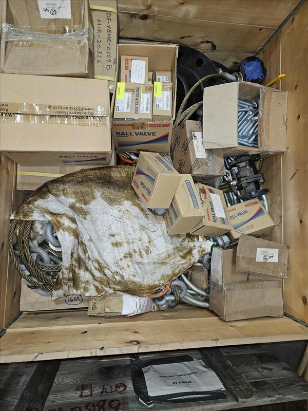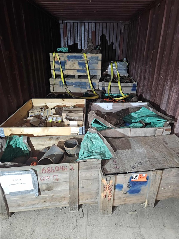 20 ft. Shipping Container w/ contents, incl: Carbon Steel flanges, elbows, tees, wire rope slings, bolts, ball valves, total gross weight of sea container & contents: 9600 kg [Sea Container WSCU 3117933] [Mandatory Loading Fee: $100]