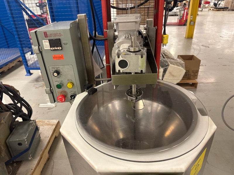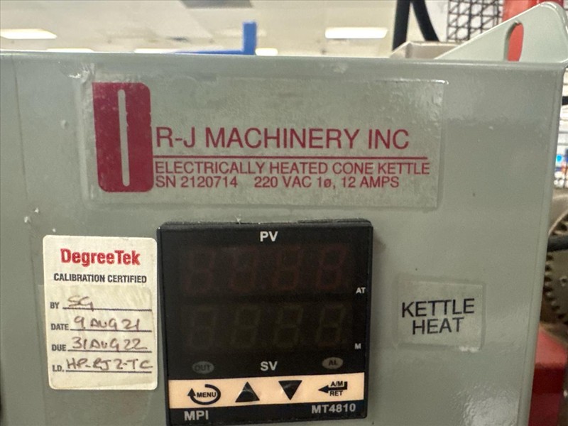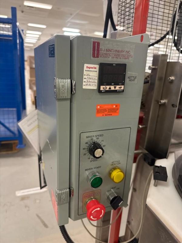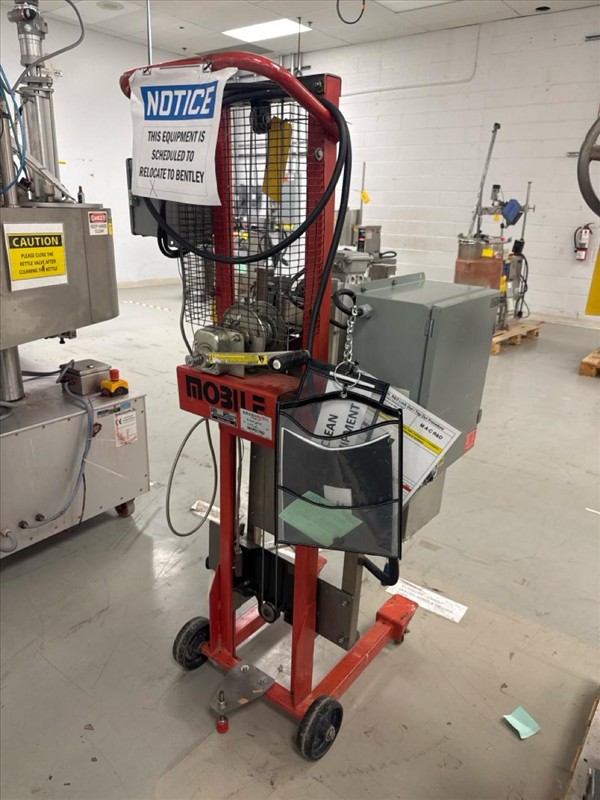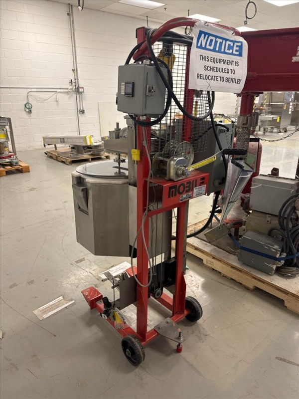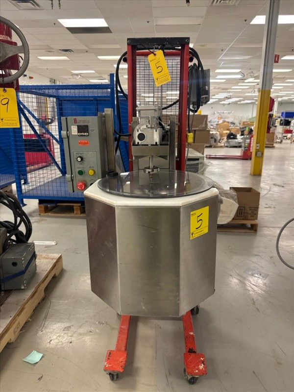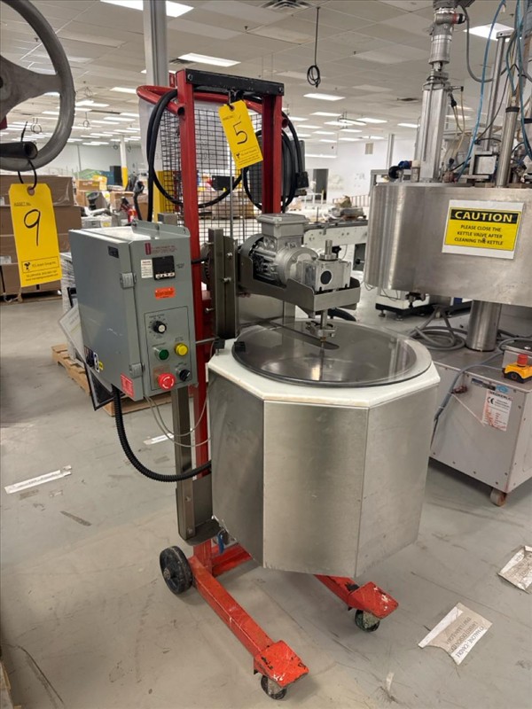 R-J Machinery Inc. Electrically Heated Cone Kettle, ser.no. 2120714, kettle size approximately 16 in. W x 16 in. D, stainless steel, c/w overhead stirrer, 0.16 hp, w/ Mobile Industries inc. Manual Winch Stacker, mod. MW 500, 500 lb. cap.